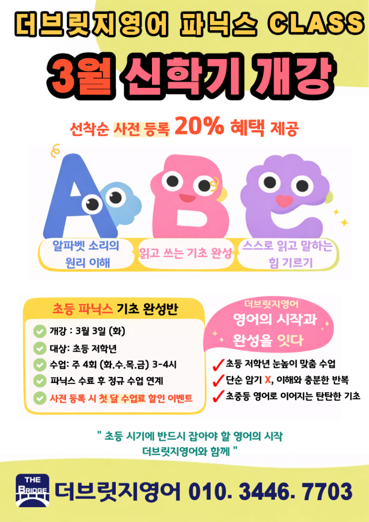 [안양 푸르지오더샵/메가트리아]더브릿지영어와 영어의 시작 파닉스, 3월 개강 안내