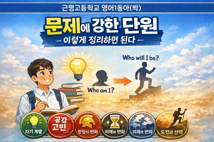 근명고등학교 영어1동아(박) 1과 내용정리 소제목 문제에 강한 단원, 이렇게 정리하면 된다 근명고등학교 영어1 1과는 처음 보면 자기계발 이야기처럼 보인다. 그런데 끝까지 읽어보면 단순한 동기부여 글은 아니다. 이 단원은 계속해서 같은 질문을 던진다. “나는 누구이고, 앞으로 어떤 사람이 될 것인가.” 그래서 시험에서도 내용일치보다는 소제목, 제목, 요지를 묻는 문제가 잘 나온다. 이 단원은 흐름을 잡아야 풀린다. 하나씩 보자. 자기 계발의 시작 완벽이 아니라, 과정에 대한 이야기 글은 지금 이 시기가 인생에서 중요한 단계라고 말하며 시작한다. 학생들은 자신이 누구인지 고민하고, 어떤 사람이 되고 싶은지도 생각한다. 여기....... <img src="https://blogthumb.pstatic.net/MjAyNjAyMDdfMTYx/MDAxNzcwNDQyNjcwMjAw.h9ymO43QIhsMFxYqVEe2IP5f81K0vruDHKKcLpphd4Eg.2Espev_av7pTgTzyCEtbGbik4Y8fX4tczXZpwKsr0ksg.PNG/%B1%D9%B8%ED%BF%B5%BE%EE%BD%E6%B3%D7%C0%CF.png?type=s3" />