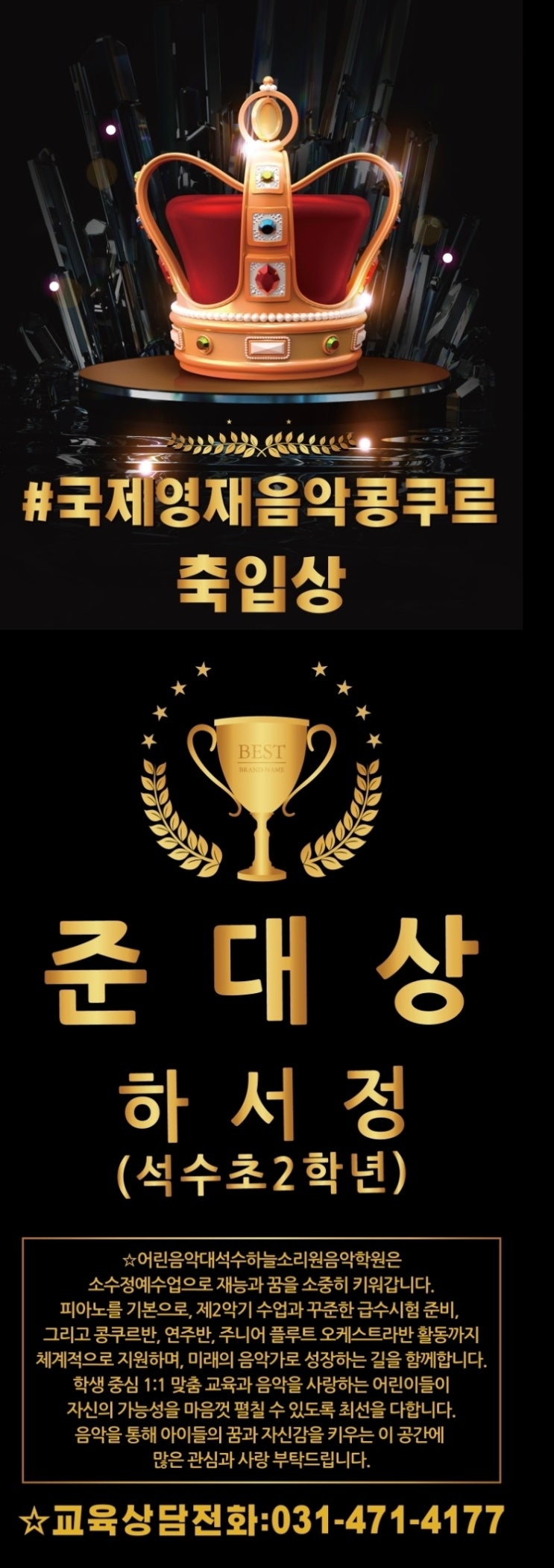 충훈부음악학원콩클석수초2학년준대상축하합니다.