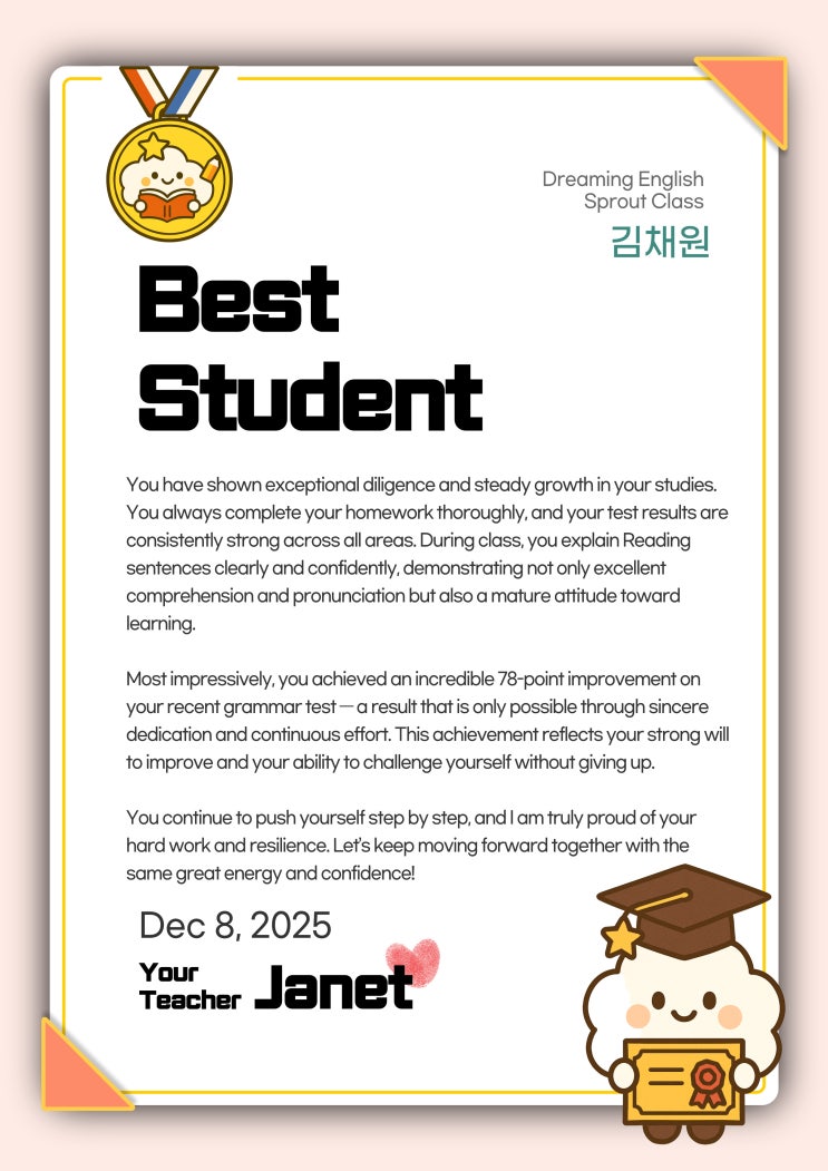 12월 한 달 동안에도 아이들의 꾸준한 태도와 작은 성취들이 선생님 마음을 참 따뜻하게 해주었어요 이번 달에는 Bloom Class의 김채원, 그리고 Rise Class의 조정현 학생이 12월의 Best Student로 선정되었습니다 두 친구가 어떤 모습으로 성장하고 있는지 조금 더 자세히 소개해드릴게요! Bloom Class — 김채원 (Rise → Bloom 전환) 채원이는 늘 성실함의 정석처럼 공부하는 학생이에요. 숙제를 빠짐없이 해오는 것은 물론, 모든 테스트에서도 안정적으로 좋은 결과를 보여줍니다. 수업 시간에 Reading 문장 해석을 발표할 때면 주저함 없이, 또박또박 문장을 설명하는데 이해력도 깊고 발음도 정말 좋아요 특히! 이번에 다시 치른....... <img src="https://blogthumb.pstatic.net/MjAyNTEyMDRfMTUz/MDAxNzY0ODI5OTcyNDU5.TfbINBVbaRSWit-RaSM9_aOxqFIzme6VkmdzgaWLNjkg.QNaKwHl6on-ONpCDUEmQokK7Kwy-Chm0DyQJScjbUYcg.JPEG/001.jpg?type=s3" />