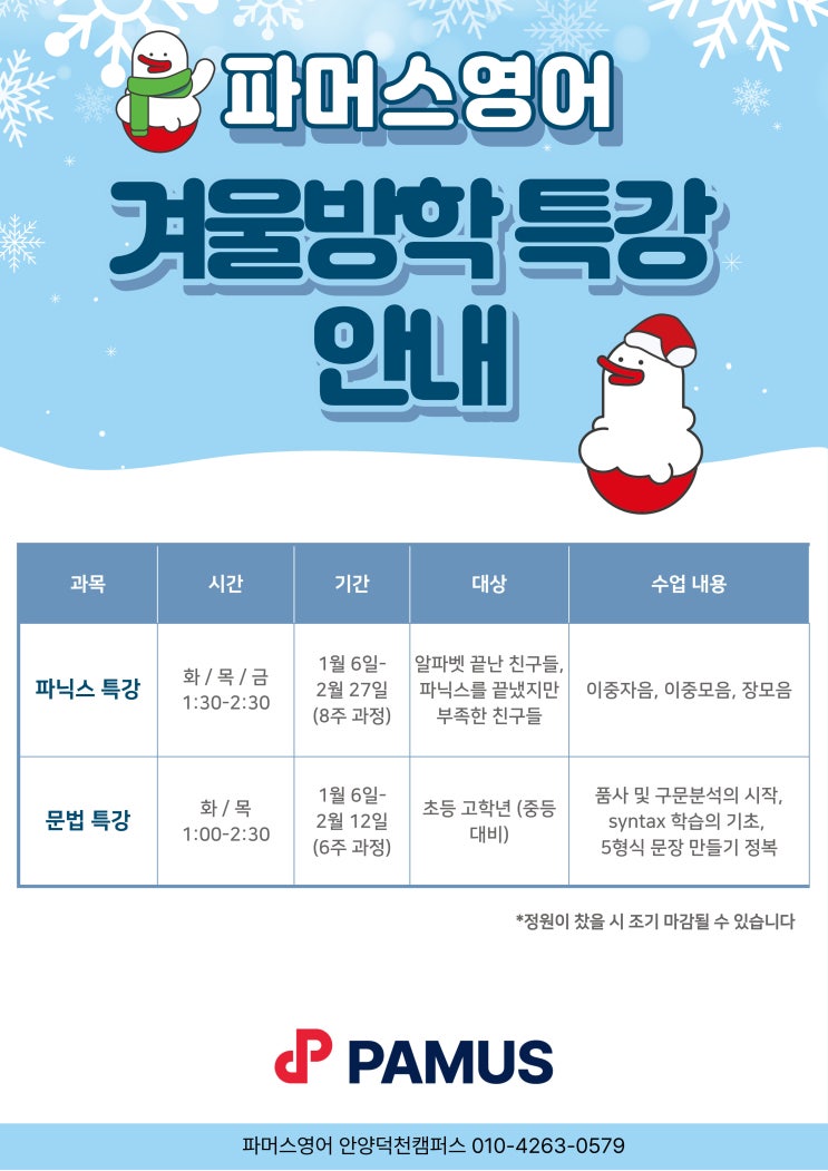 Winter Intensive English Program — 파닉스 · 문법 기초력 완성반 이번 겨울, 파머스 영어학원에서는 아이들의 영어 학습에서 비워져 있던 핵심 영역을 정확한 분석을 바탕으로 채워주는 관리 기반 집중반을 운영합니다. PHONICS(파닉스) : 구조적 보완 프로그램 정확한 음가 인지, 장·단모음, 이중자음, 블렌딩 등 학생별로 누락된 파닉스 단계만 골라 집중 보완하여 읽기 능력의 안정적 완성을 목표로 합니다. (알파벳 음가를 마친 아이들 대상으로 진행합니다) GRAMMAR : 개념·실전 통합 프로그램 필수 기초 개념을 체계적으로 정리한 후 실제 문장과 직접 접목하여 문법을 습득하는 훈련까지 진행합니다. 개념 이해 → 문장 적용까지 한 흐....... <img src="https://blogthumb.pstatic.net/MjAyNTEyMDVfMjU4/MDAxNzY0OTIxMjE4MDU3.kMah6Uxi3SvEpt5rzfQDM1TP-jGriDPkra9YyGykJvAg.TjmCnfDSg_9CHPcSHvsdm15JecMus-GopR1U26nnZeAg.JPEG/KakaoTalk_20251205_155822560.jpg?type=s3" />