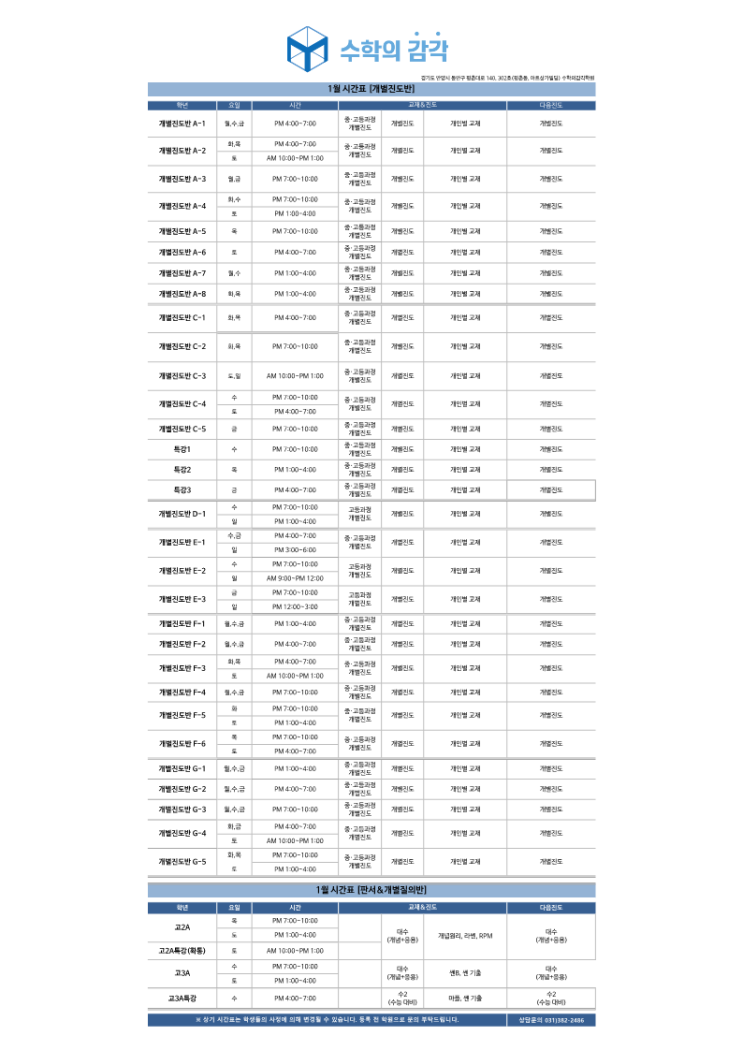 [수학의 감각 평촌] 1월 시간표 안내