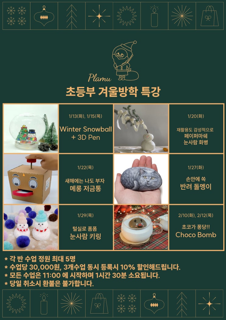 안녕하세요? 즐거운 샘 입니다!! 초등부 친구들 많이 기다렸죠? 길고 긴 초등부 친구들의 겨울 방학을 즐겁게 해줄 겨울방학 특강이 드디어 공개된답니다!! 방학동안 다양한 활동도 경험하고 미술 실력도 한단계 UP!! 해보자구요!!! 먼저 다양한 활동을 할 수 있는 원데이 클래스!! 계절과 딱 맞는 아주 재미있는 수업들이 가득하지요? 특히.. 요리 수업을 너무나 원하는 초등부 친구들을 위해 [Choco Bomb] 만들기 수업을 준비했어요~!! 기간도 딱 발렌타인데이 즈음이라 직접 만든 핸드메이드 선물로도 제격이겠지요? 그리고 방학동안 갈고 닦아 그림 실력을 UP해보겠다!!! 결심한 친구들!!! 기초부터 차근차근 익힐 수 있는 소묘 특강과 예술....... <img src="https://blogthumb.pstatic.net/MjAyNTEyMjBfMjQw/MDAxNzY2MjE2NzExMDIw.Cmk5hN8y4bsx1vJuS8ZNtjltKhFJ3kEiTPf1opWYPXsg.6C-_2On6_4QaavoFssSTdMYdSRV9YcBfwT0yj-YikM4g.JPEG/%C3%CA%B5%EE%BA%CE_%B0%DC%BF%EF%B9%E6%C7%D0_%C6%AF%B0%AD.jpg?type=s3" />