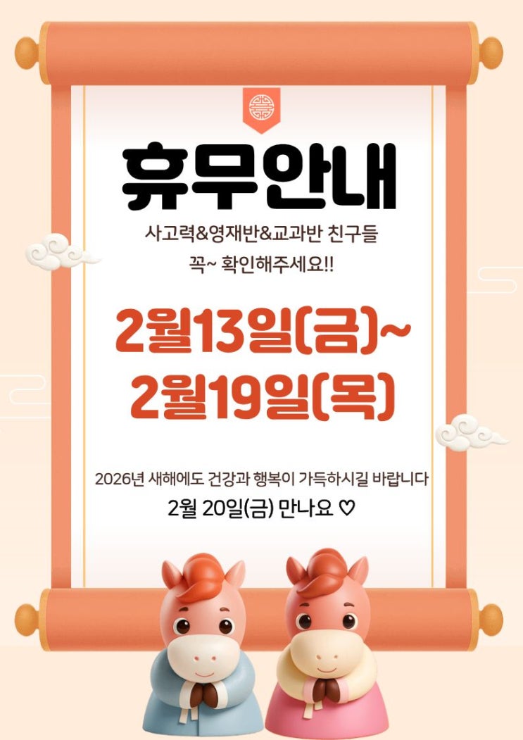 안녕하세요 일직동 초중 수학 파크자이 스마트 해법수학 입니다 추웠던 날씨도 한결 풀리고 긴 겨울방학도 얼마 안 남 았습니다 저희 파크자이 해법수학은 2월12일 2월13일 방학특강을 종강합니다 설연휴와 새학기 준비 할 시간을 위해 특강기간을 여유 있게 진행했습니다 방학동안 아침 잠을 포기하고 정해진 시간에 와서 공부한 해법이들♥♥ 열심히 해준 덕에 계획했던 방학특강 진도는 모두 완료했습니다 오늘 좋은 하루 시작하시고 새해 복 많이 받으세요 새해에는 원하시는 일 모두 이루세요~^^ 등록번호 3201호 초중 교과수학 수강료 20~25만원 <img src="https://blogthumb.pstatic.net/MjAyNjAyMTJfMjA2/MDAxNzcwODU2MTQ2NjUy.bv8Qm5oZxWNGuklzEO2V-qAn8Bn6mf4jJxXccRYjZmIg.BnNBE6TtT9r2PGuMzBfdmfThLpwWaCUhTtyJ0i89VrYg.JPEG/2026%BD%C5%C7%D0%B1%E2%C0%FC%B4%DC%28A4%29.jpg?type=s3" />