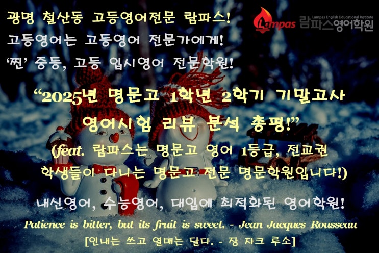 안녕하세요~ 광명 영어학원 철산동 명문고 내신전문 람파스입니다. 겨울방학이 한창입니다. 매서운 겨울 날씨에 방학은 잘 보내고 있겠죠? 본원에서는 겨울방학을 맞아 그동안 학기 중 내신대비로 인한 시간 부족 때문에 제대로 다루지 못했던 기초, 기본 문법과 서술형 영작 연습, 고난도 독해를 필두로 5주 단기 2000개 수능필수어휘 암기 프로그램까지 다양한 특강과 정규수업 커리큘럼으로 그동안 자신에게 부족했던 부분에 대한 확실한 메꿈과 보완은 물론 지금보다 더 앞으로 나아가기 위한 실력 업그레이드가 한창 진행 중입니다. 지난 시험에 대한 분석과 성찰 또한 그 일환이 되겠지요. 자신의 부족한 부분이 무엇인지 그 약점을 정확하....... <img src="https://blogthumb.pstatic.net/MjAyNjAxMjVfNzcg/MDAxNzY5MzEwMjY1OTcy.QOXGIzJP810rxCBru4hM1YHbd3YP8aChhcgseITYPdcg.Wif5LtbE3ecRni04on60Yky_JA5Q0hHEZ2AoQdab9LEg.JPEG/%B1%A4%B8%ED_%BF%B5%BE%EE%C7%D0%BF%F8_%C3%B6%BB%EA%B5%BF_%B8%ED%B9%AE%B0%ED_%B3%BB%BD%C5%C0%FC%B9%AE_%B6%F7%C6%C4%BD%BA_2025%B3%E2_%B8%ED%B9%AE%B0%ED_1%C7%D0%B3%E2_2%C7%D0%B1%E2_%B1%E2%B8%BB%B0%ED%BB%E7_%BF%B5%BE%EE%BD%C3%C7%E8_%C3%D1%C6%F2_%C0%CC%B9%F8%BF%A1%B5%B5_%BF%AA%BD%C3_%C0%FC%B1%B3%B1%C7_%B9%E8%C3%E2_%28%BF%B5%BE%EE_1.jpg?type=s3" />
