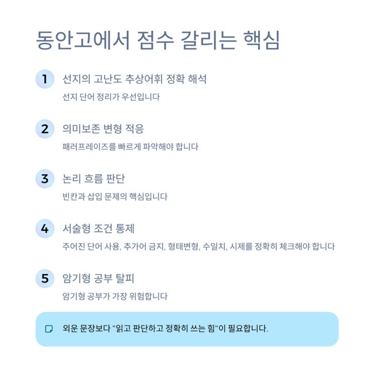 동안고 영어 개강 확정. 동안고 대표유형 확인(복습)테스트 + 단어 50분 테스트 후 2시간 수업. 학교별 분반, 진단으로 현재 우리아이 감점 포인트부터 확인하세요. 동안고 영어 시험은 한 줄로 요약하면 암기형이 아니라, ‘선지 해석 + 변형 적응 + 서술형 조건통제’로 실력을 가르는 시험입니다. 동안고에서 진짜 점수 갈리는 핵심 포인트 5개 1) 선지에서 등급이 갈립니다 지문을 대충 이해해도, 선지의 고난도 어휘/추상어휘를 정확히 해석하지 못하면 오답으로 끌려갑니다. → ‘내용 이해’와 ‘지문 암기’만으로는 부족하고, 1~5번 선지 해석력 자체가 실력입니다. 2) 생지문/변형 지문 적응력이 필수입니다 공부했던 문장을 그대로 내....... <img src="https://blogthumb.pstatic.net/MjAyNjAxMzBfMjA4/MDAxNzY5NzQwMzQyOTQ3.vl0W88yOsIX-rOtkmh9uTbKPZeazPVP6XPaUYhoLNbEg.q9pb9wxcm0x8E5rZZ4ATEUEgBPIJmGM1AjcIiS2M3bIg.JPEG/IMG%A3%DF3788.jpg?type=s3" />