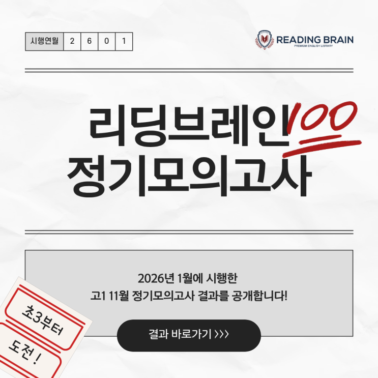 안녕하세요 영어를 넘어 세상을 읽는 힘, 광명 일타영어학원 리딩브레인 영어학원입니다 :) "리딩브레인 정기모의고사" 너도 할 수 있어! 초3부터 도전하는 영어 모의고사 오늘은 저희가 이번에도 진행한 정기모의고사 이야기를 나누고 싶어요. 이번에도 우리 리브둥이들이 모의고사에 도전했는데 정말 기대 이상의 멋진 결과를 보여주었답니다. 고1 11월, 어느 정도 수준인가? 이번에 리딩브레인 아이들이 치른 고1 11월 모의고사는 사실상 '예비고2 시험'이에요. 시험을 치르고 나면 바로 고등학교 2학년이 되기 때문에 갑작스러운 변화에 적응하도록 난이도를 높이는 경향이 있기 때문인데요. 따라서 고1 3월 모의고....... <img src="https://blogthumb.pstatic.net/MjAyNjAxMzBfMjY2/MDAxNzY5NzU1MTQxOTUw.LaFBZQ5oJEeRYrgagQJhILXisDX1FnXQRDsRIkNyyhAg.g3CsXnWHBp6ibgqSHvWFBHnkPoayW05Fms9pCUNNmh0g.PNG/1.png?type=s3" />