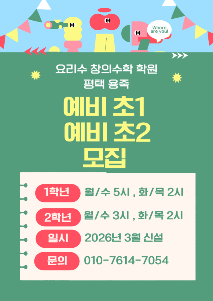 안녕하세요~~^^ 요리수 창의수학 학원 용죽입니다~~ ^^ 그동안 "신설반이 언제 열리나요? "라는 문의를 많이 받았습니다. 저희는 정원을 지키고 저학년은 학년별로 반을 개설하기 때문에 시간이 나오지 않아서 반을 신설하지 못했습니다. 드디어!!! 2026년 3월에는 기다려 주셨던 예비초1, 예비초 2 신설반을 개설합니다!!! 선착순으로 모집합니다. 저희 학원은, 1:4 수업을 진행하며 정기적인 피드백을 진행하고 있습니다. 정규 수업전, 한명 한명 세심히 테스트하고 어떻게 수업을 진행할 지 상담드리고 있습니다. 상담문의는, 010.7614.7054입니다. 더 많은 소식은 인스타그램에 있습니다. #용죽요리수#용죽요리수학원 #평택수학학....... <img src="https://blogthumb.pstatic.net/MjAyNjAxMTZfMjky/MDAxNzY4NTcwMTUzNzk3.y3_I47VoxfQIT16OVWoIhsJZ3J3x3X8zVgAuHs-b9owg.0Wd0J8-8PxyUsIssTagPvqCjqDzeXevalh8oNHAy1zYg.PNG/KakaoTalk_20260115_223116764.png?type=s3" />
