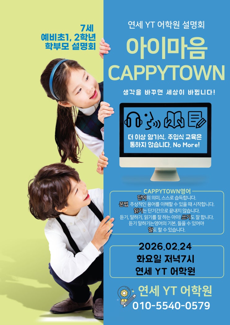 세교동 영어학원 연세YT어학원은 7세 및 예비 초1, 예비 초2 학년 학부모님을 대상으로 아이의 영어 학습 방향을 근본부터 다시 생각해 보는 시간 그리고 바른 영어 학습을 위한 설명회를 진행합니다. 7세 예비 초1, 2학년 학부모 설명회 ▪ 일정 : 2026년 2월 24일 (화) 저녁 7시 ▪ 장소 : 연세YT어학원 ▪ 대상 : 7세, 예비 초등 1학년, 2학년 학부모님 생각을 바꾸면 아이의 영어가 달라집니다 생각을 바꾸면 세상이 바뀝니다. 아이마음 캐피타운 영어의 핵심 철학은 바로 이 문장에 담겨 있는데, 지금까지의 영어교육을 떠올려보면, 단어를 외우고 문법 규칙을 먼저 배우는 암기식 및 주입식 교육이 중심이었어요. 하지만 이런 방식은 아이....... <img src="https://blogthumb.pstatic.net/MjAyNjAyMDlfNjQg/MDAxNzcwNjA3NTIyNDYx.3sYFyAgOux2oR5v74LvaExGtuhpuHxlA7R_KvQb-9R0g.FAUlxCZcHy80Bx-9m2tv7uT6zHuMJnVq6R1YUGKaH_4g.JPEG/%25EC%2584%25A4%25EB%25AA%2585%25ED%259A%258C_01.jpg?type=s3" />