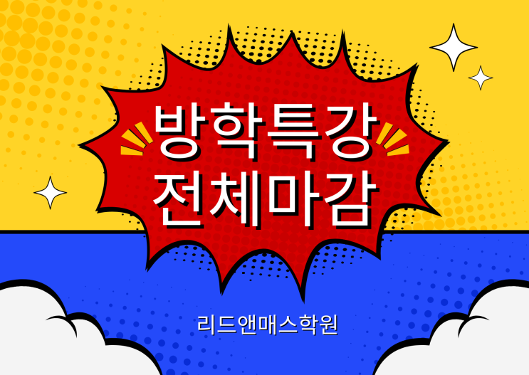 [겨울방학특강] 전체 마감 안내드립니다 이번 겨울방학특강이 전 일정 모두 마감되었습니다. 많은 관심과 믿음으로 신청해주신 학부모님들께 진심으로 감사드립니다. 이번 특강은 단순히 방학 시간을 채우는 수업이 아니라, ✔ 다음 학기 학습을 위한 기초 개념 정리 ✔ 아이마다 다른 속도를 고려한 개별 진도 관리 ✔ 이해 → 적용 → 점검까지 이어지는 완성형 수업 구조 를 목표로 준비했습니다. 특히 리드앤매스의 겨울방학특강은 국어·영어·수학의 균형 있는 학습 기반을 다지는 데 집중합니다. 국어는 읽고 이해하는 힘, 생각을 정리하는 힘 수학은 연산을 넘어 사고력으로 연결되는 구조 영어는 쌓아온 기초가 흔들리지 않도록 정리와 체....... <img src="https://blogthumb.pstatic.net/MjAyNTEyMTdfMzcg/MDAxNzY1OTgxNzUyMjI4.JnoY3G7hbkhIqVKFyuB59CPYU1zwo2ChhU5hJGmNyg0g.X8zbIDMXvNzTqtVbveWg-l2he4mraHSpd7uO3sqL82wg.PNG/%B9%E6%C7%D0%C6%AF%B0%AD.png?type=s3" />