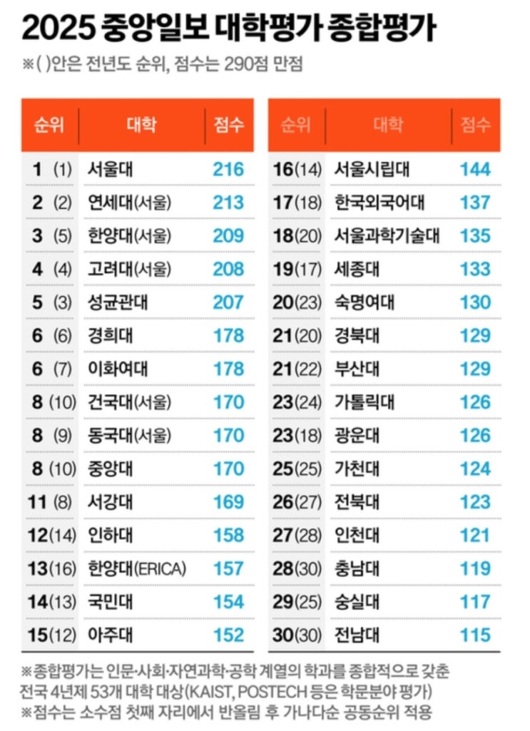 올해 종합대학 평가의 가장 큰 특이점은 한양대의 약진이라 볼 수 있습니다. 전통의 스카이라인을 제치고 처음으로 3위에 올라간점이 눈에 띄는 점입니다. 지방 분교중에서도 한양대 에리카가 항상 수위권이긴 했지만, 아주대, 서울시립대, 국민대보다 위로 평가된점이 한양대 본교, 분교에게는 큰 변화라 생각합니다. 15-30위권에서의 변화는 광운대의 5계단 하락을 제외하고는 눈에 띄는 변화는 없어 보이지만, 매년 줄어드는 수험생과,AI의 돌풍으로 전통의 전자,컴퓨터 공학부의 쇠락이 앞으로 큰 변수로 작용하지 않을까 예상됩니다. -중고등학생 내신수능전문 아벨그룹과외- #아벨그룹과외 #아벨공부방 #봉담공부방 #봉담과외 #와우리공부....... <img src="https://blogthumb.pstatic.net/MjAyNTEyMThfMjgy/MDAxNzY2MDYyNjc1NDgx.9kxRTkDvaoTBhYGurS86RHTGU5Aafge84g3ZQRdzTY8g.2d6WqVG-mRdJB9rvQ0lwhye5m5hxr04ffvrXpUyma94g.JPEG/900%A3%DF2025%A3%DF1128%A3%DF007.jpg?type=s3" />