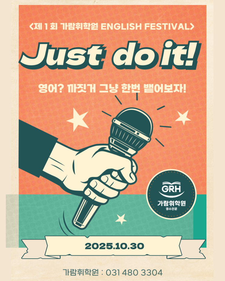 안녕하세요! Finally, Steady wins the race! 가람휘학원입니다! 갑자기 쌀쌀해진 요즘 잘 지내고 계신가요? 가람휘학원은 지난 30일에 학원에서 조그마하게 파티를 열어 할로윈 을 즐겼습니다! 할로윈 파티 당일! 우리는 가람휘만의 작은 English Festival 을 개최했습니다! https://blog.naver.com/woong2325/223786545782 지난 3월 아이들 앞에서 약속했던 것 처럼, 아이들에게 영어 스피킹 환경을 만들어주기 위해 영어로 질문도 해보고, 영어이름도 만들어봤습니다. 그리고! 이제는 실전이다!! 학원친구들 앞에서 영어로 자신의 취미를 말해보는 시간을 갖기로 한거죠! 그리고 Festival 당일! 원장인 제가 직접 1번이 되어....... <img src="https://blogthumb.pstatic.net/MjAyNTExMDdfMTQy/MDAxNzYyNDQ3MTQ2MDEw.Xh_dsNgYvR05UtPAxDam0mOyGZc6_A6nYzOkBPhNbh4g.oBE3AsyBJAnIaGG6gFGbMfGceWkQ6YCn9iIGQZ09EYQg.PNG/%B8%BB%C7%CF%B1%E2Fist.png?type=s3" />