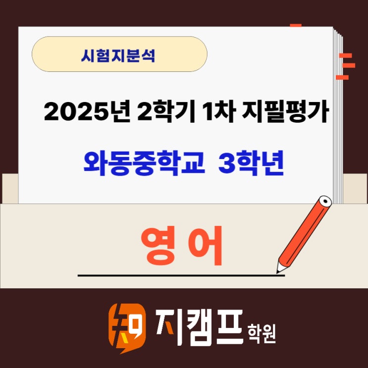 안녕하세요, 지캠프학원입니다. 이번 2025학년도 2학기 기말 지필평가가 마무리되었습니다 지캠프학원은 시험 문제 분석을 통해 학습 방향 정하기도 합니다. “어휘 이해 – 문법 적용 – 독해 표현력”의 3단계 성장 포인트를 중심으로 분석합니다 와동중학교 3학년 영어입니다. 시험지는 저작권 관계로 공개할 수 없음을 양해 바랍니다 1. 분석 대상 및 평가 방법 대상: 와동중학교 3학년 영어 일시: 2025년 11월 19일 시행 평가 범위 대화문 완성 문법·어휘 인물 중심 지문(da Vinci / Franklin 계열) 문맥 어휘 선택 관계사·접속사·시제 분석 방법 문항별 정답률 오답 유형 문맥 이해 기반 독해력 분석 학생 사고 과정 기반 이해도 평가 문항....... <img src="https://blogthumb.pstatic.net/MjAyNTExMjVfMjUg/MDAxNzY0MDY1NzA2ODg5.V0gVDQ9k5fwB8TXxw9zDS3-0nDBmRbM3-d8JLvkZ8Lcg.BPGqh2it7Av7BLlMn0k1es7DtO1GHFRRPRR239mCWfwg.JPEG/%C1%A6%B8%F1%C0%BB_%C0%D4%B7%C2%C7%D8%C1%D6%BC%BC%BF%E4_-003_%281%29.jpg?type=s3" />