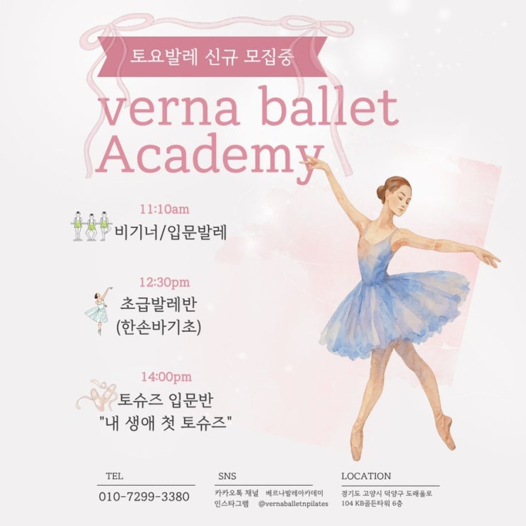 성인 발레 토요반 신규 개설 안내 11:10 am 입문/비기너 발레(70min) 12:30 pm 한 손 바 기초 발레(70min) 14:00 pm "내 생에 첫 토슈즈”(30min) 개설되었습니다. 발레 경력 6개월 이상 되신 분들께서는 상담을 통해 토슈즈반 수강이 가능하십니다❤️ 토슈즈반은 토슈즈 준비를 미리 해야 하며 토슈즈 길들이는 과정/ 신는 방법 등 기본기부터 차근차근 배워가실 수 있도록 수업할 예정입니다^^ 토요반 수강 신청 문의는 네이버 톡톡 / 카카오톡:vernaballet / 010-7299-3380 언제든지 편하게 문의하세요♀️ <img src="https://blogthumb.pstatic.net/MjAyNjAyMTRfMTAz/MDAxNzcxMDYzNTg1Mzg4._4pWkA3BumCn0VJPnMnC51JOKqS47mWwepvjflOOwaMg.qwoyHHh4n7FEXn3LERARhJAP4HFTWjEZqgdogYhSpl0g.JPEG/IMG%A3%DF8175.JPG?type=s3" />