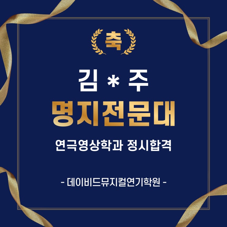 안녕하세요? 데이비드쌤이에요~! 데이비드뮤지컬연기학원은 재입시반을 운영중이에요. 소수정예로 수업중인 재입시반 1년의 시간끝에 합격의 영광을 얻은 기쁜 소식이에요! 명지전문대학교 연극영상학과 정시 최종합격 김 * 주 재입시반으로 밤낮가리지 않고 열심히 일하면서 틈틈히 학원 수업과 연습을 병행하며 외로운 싸움을 한 학생이에요. 배우를 향한 새로운 첫걸음을 데이비드뮤지컬연기학원이 응원합니다!! 지축 데이비드뮤지컬연기학원 지축 이준프라자 301호 연기. 뮤지컬. 무용 전문학원 그룹수업 - 7세 ~ 중3 주1회/2시간 기초부터 공연까지 화 - 오후 4시 ~ 6시 수 - 오후 5시 ~ 7시 목 - 오후 6시 ~ 8시 금 - 오후 4시 ~ 6시(n....... <img src="https://blogthumb.pstatic.net/MjAyNjAyMTlfMjQ0/MDAxNzcxNDk3ODcyOTI5.cxmqOi7iQ3_jC626Pg-fbYXQhkq5ySG80b9JiJm4ctkg.6P7gFWS4U10uJprNTUwS_bIk49Xv8Yi1d4hDJC5dvxkg.JPEG/%C1%A6%B8%F1%C0%BB-%C0%D4%B7%C2%C7%D8%C1%D6%BC%BC%BF%E4_-001_%287%29.jpg?type=s3" />