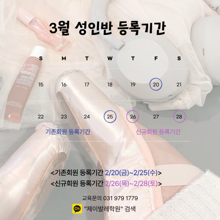 안녕하세요 행신동 발레 전문 교육기관 J발레학원 입니다. 3월 성인반 등록기간을 알립니다 ❤︎ <기존회원 등록기간 2/20(금)~2/25(수)> <신규회원 등록기간 2/26(목)~2/28(토)> 기타 수업 문의 031 979 1779 카카오톡 채널 "제이발레학원" 검색 네이버 톡톡 #제이발레학원 #고양시발레학원 #행신동발레학원 #행신발레학원 #일산발레학원 #성인발레 #전공발레 #초등발레 #취미발레 #입시발레 #j발레학원 <img src="https://blogthumb.pstatic.net/MjAyNjAyMjBfMTY3/MDAxNzcxNTc3NTIxMTMy.nw0K3VOFVaNL3vZKv6PcBO_ErLnBq8TwAGedzUZyqsYg.BT3Oo0KGXGDmuxVZkh9311f2ci6Yp0BZ2QJduSvoSQkg.PNG/%C1%A6%B8%F1%C0%BB_%C0%D4%B7%C2%C7%D8%C1%D6%BC%BC%BF%E4._%289%29_2.PNG?type=s3" />