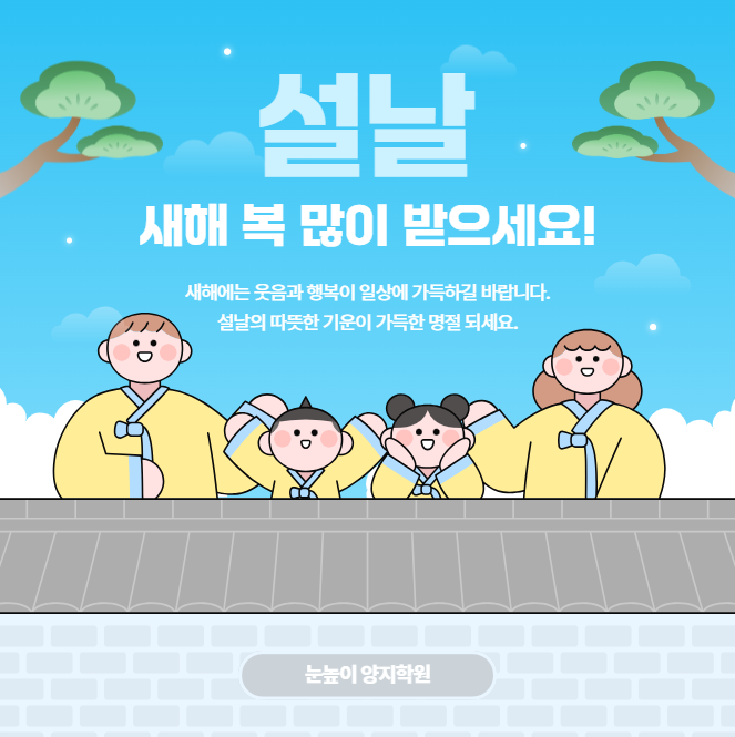 안녕하세요! 눈높이 러닝센터 양지학원입니다. 올 한해도 댁네 가정에 건강과 행복이 깃드시길 진심으로 바라겠습니다. 항상 귀한 자녀를 눈높이에 맡겨주셔서 진심으로 감사드리며, 올 한해도 아이들의 좋은 학습효과로 더욱더 나아가 최선을 다하는 양지학원이 되도록 노력하겠습니다. 감사합니다. 설 연휴 휴원기간은 2월 16일 월요일 ~ 2월 18일 수요일이며, 보강수업은 설 전,후 주차에 진행됩니다. #대교 #눈높이 #양지학원 #새해 #2026년 <img src="https://blogthumb.pstatic.net/MjAyNjAyMTNfMzYg/MDAxNzcwOTc4MjU3Mjg2.tFsjS8YgKABDodBAj1zeak89vrjfS4iXA-shYOi6FOIg.gPQDK6A57nX0ELexcqnpt_I7R-TadIztjBwjE_Ui0Bog.PNG/KakaoTalk_20260212_143318853.png?type=s3" />