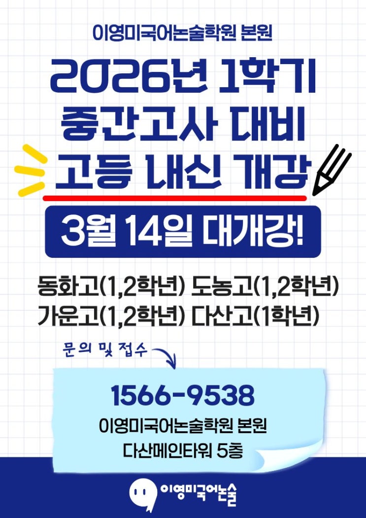 안녕하세요. 이영미국어논술학원입니다. 본원, 진건지구 캠퍼스 2026년 1학기 중간고사 중·고등 내신 개강 일정 안내입니다. 정원제 운영으로 인해 일부 반은 조기 마감될 수 있으니 상담·문의는 대표번호 1566-9538로 연락 부탁드립니다. 본원 고등 내신 개강 3월 14일(토) [본원 고등 내신 개강 일정] 개강일: 3/14(토) 개강 학교 및 학년 ① 동화고 1,2학년 ② 도농고 1,2학년 ③ 가운고 1,2학년 ④ 다산고 1학년 본원 중등 내신 개강 3월 14일(토) [본원 중등 내신 개강 일정] 일정: 3/14(토) 개강 학교 및 학년 ① 동화중 2,3학년 ② 도농중 2,3학년 ③ 다산한강중 2,3학년 본원 삼육중 내신 개강 3월 22일(일) [본원 삼육중 내신 개강 일정....... <img src="https://blogthumb.pstatic.net/MjAyNjAyMTRfODkg/MDAxNzcxMDUwNTc1Mzgx.N4goaMdSJLL6BTp0myv8QmCLK_Q_FNxeVRRvMBGrdtgg.4tZgwAUxzEdOBPq1W0crds9qdhuOymcoX8eC7p39KQcg.JPEG/%BA%BB%BF%F8_%B0%ED%B5%EE_%B0%B3%B0%AD.jpg?type=s3" />