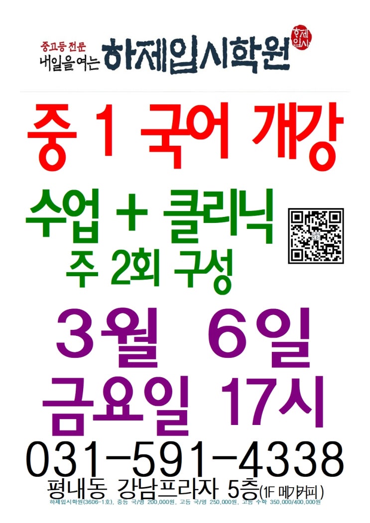 평내호평 중등국어, 고등부 입시의 노하우로 시작합니다!(중1 국어 개강 안내)