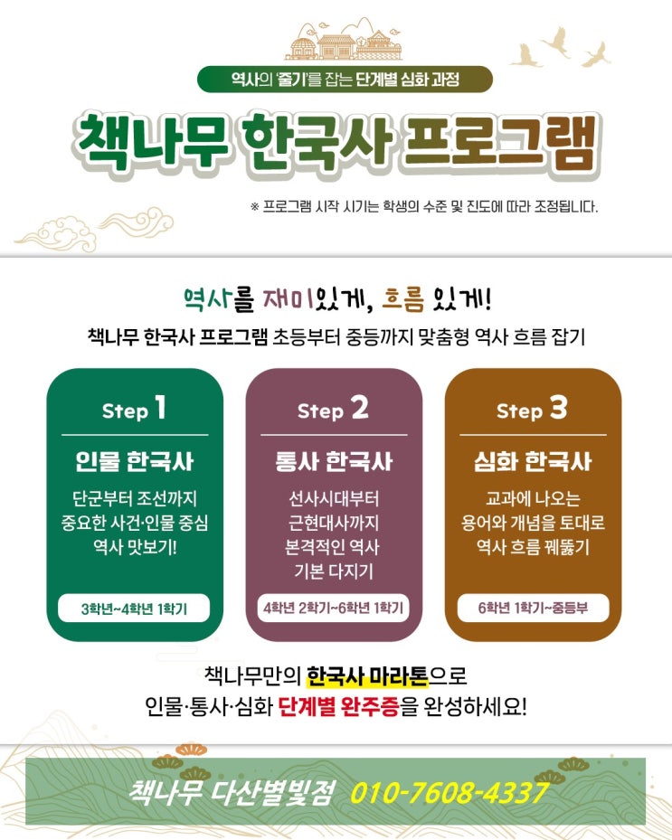 아이들이 배우는 ‘역사’는 단지 오래된 과거가 아닙니다. 지금 우리가 서 있는 자리, 그리고 앞으로 나아갈 길을 비춰주는 빛의 지도 같은 것이죠. 책나무 한국사 프로그램은 아이의 발달 단계에 꼭 맞춘 3단계 심화 역사 커리큘럼으로, 초등부터 중등까지 자연스럽게 이어지는 ‘역사 흐름의 감각’을 만들어 줍니다. 그저 외우는 역사가 아니라, 이해하고 연결하며 스스로 읽어내는 힘을 기르는 과정— 그게 바로 책나무 한국사의 철학입니다. ✨ 왜 책나무 한국사인가? 아이의 머릿속에 역사는 처음엔 복잡한 미로처럼 보입니다. 날짜와 이름이 가득하고, 사건은 서로 연결되지 않은 조각 같죠. 하지만 올바른 순서로, 올바른 깊이로 안내해....... <img src="https://blogthumb.pstatic.net/MjAyNTExMTRfMjU1/MDAxNzYzMDk4NDk2MTY4.CmQDFYSHtTpntAahbHzVDsqqFBieiFw1GQYAebFZE3kg.aTUPeaxlUyar9VtRDyNcjLEZh_3uzF7fuPjWCUSKOIIg.JPEG/%BD%BD%B6%F3%C0%CC%B5%E55.JPG?type=s3" />