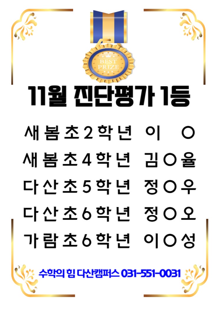 안녕하세요~ 수학의힘다산진건캠퍼스 입니다!! 갑작스런 폭설에 쌀쌀한 날씨가 제법 겨울다운 요즘입니다^^ 춥고 눈이와도 열심히 달려준 우리 수학의힘 친구들~ 9월~11월까지 수업했던 내용을 좀 더 심도있는 내용으로 분기마다 시행하는 진단평가를 치뤘어요~ 기본-응용-심화 문제로 이루어진 문제로 학생들이 놓치고 있는 부분이나 부족한 부분을 점검하면서 반 이동이나 레벨 변동이 있을 수 있는 시험이기도 합니다~ 어려운 시험이고 힘든 시험이기에 학원 자체적으로 진단평가는 학원에서 정한 일정 점수 이상을 받은 친구들에게만 명단을 내어 주었습니다~ 11월 진단평가 1등 친구들과 성적향상자 친구들 소개합니다^^ 3개월마다 있는 진....... <img src="https://blogthumb.pstatic.net/MjAyNTEyMTBfNDYg/MDAxNzY1MzU3MTczNTQ5.pWs660Ytojbj8gCyE2qoMHrGz0VyDqk03TjPYm__roYg.qX3o7LfofFdhvDu7SpRKSwEa6DzKBiAkYxCu_pJTg_gg.JPEG/001.jpg?type=s3" />
