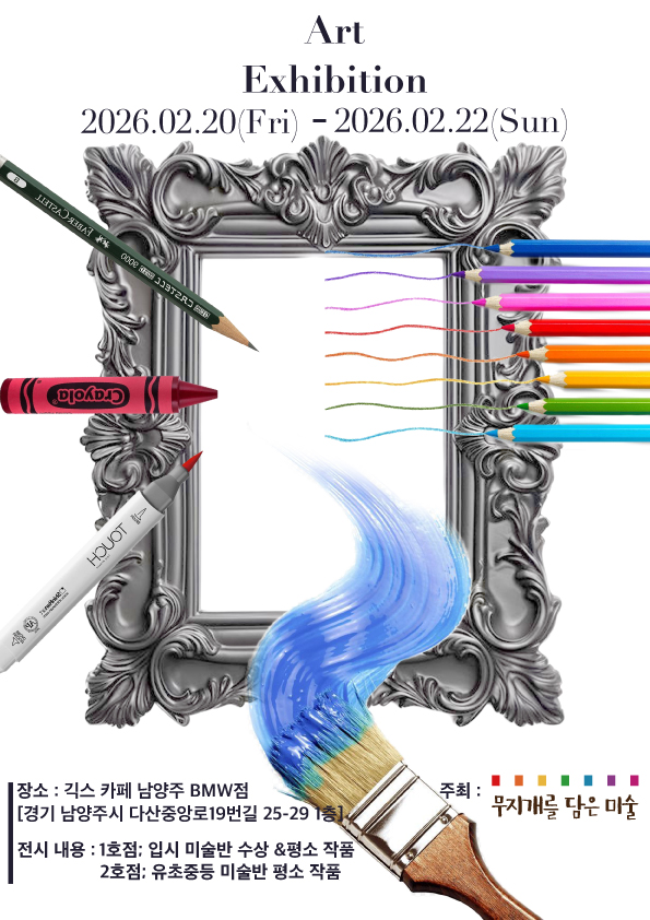 안녕하세요~ 무지개를 담은 미술입니다. 무지개를 담은 미술학원 제 3회 전시를 기록해보려 합니다. 2026.02.20(금)-02.22(일) 삼일간 진행했는데요~ 이번에는 긱스카페를 대관하여 3일간 넉넉하게 준비했어요^^ 그동안 야외공간에서 전시를 진행하였는데, 날씨의 영향도 많이 받고 시간도 제한적이더라구요. 이번기회에는 좀 더 따스한 공간에서 커피와 함께즐기실 수 있게 대관을 진행했습니다. 더불아 이번 전시는 구리 본원과 첫 합동 전시였는데요~ 본원 입시반 친구들의 작품도 구경해보며, 풍성하게 관람해볼 수 있는 기회를 만들었습니다. 목요일날 저녁에 설치를 진행했는데요~ 열심히 설치하고 통창 밖으로 바라보니 넘 뿌듯하더라구요....... <img src="https://blogthumb.pstatic.net/MjAyNjAyMjVfMzIg/MDAxNzcyMDA5NDk5ODcy.Q4v2ZqaiKWs7r_tsckYBIU412gssyBJITuitPd1ZiNQg.MXoweLDSexkDW5JkIUmO8qO2mcDtwmdW-n-cREAWW-Ig.JPEG/%C0%FC%BD%C3%C8%B8-%C6%F7%BD%BA%C5%CD.jpg?type=s3" />