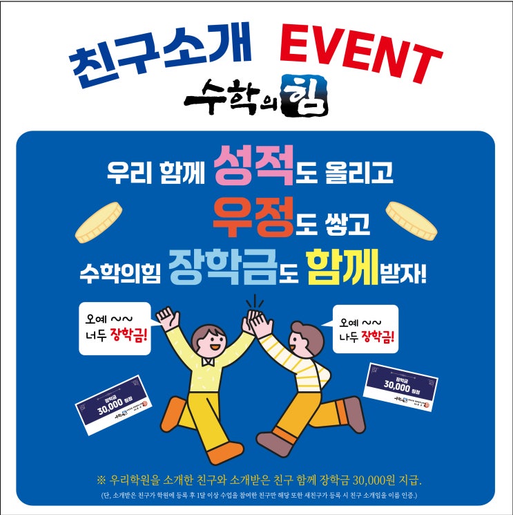 공부는 혼자 하는 것보다 함께할 때 더 즐겁고, 더 큰 시너지를 만들어냅니다. 수학의힘장현캠퍼스학원에서는 친구와 함께 실력도 키우고 특별한 혜택까지 받을 수 있는 ‘친구소개 장학금 이벤트’를 진행하고 있습니다. 친구와 함께라서 더 좋은 이유 횟수 제한 없이 친구를 소개하면 장학금이 지급되는 프로그램입니다. 좋은 학습 환경과 노하우를 서로 공유하며, 함께 성적을 올리고 우정까지 쌓을 수 있다는 점이 가장 큰 매력입니다. 일석삼조, 한 번의 선택으로 세 가지 혜택 수학의힘에서는 이 이벤트를 ‘일석삼조’라고 부릅니다. 한 번의 행동으로 여러 가지 이득을 얻는다는 의미처럼, 성적 향상 친구와의 동기부여 장학금 혜택 까지....... <img src="https://blogthumb.pstatic.net/MjAyNjAyMjRfMTg5/MDAxNzcxOTE1MzM3MDY4.WMr8dkDXYhQeHdGK8mZVpF-tyTxPaDI37wk8OotNKggg.DLeTDYdGVo3vNKVuqJk7EPto4zQP48DoWOfRetOq1cYg.JPEG/%C4%A3%B1%B8%BC%D2%B0%B3%C0%CC%BA%A5%C6%AE%B1%A4%B0%ED.jpg?type=s3" />