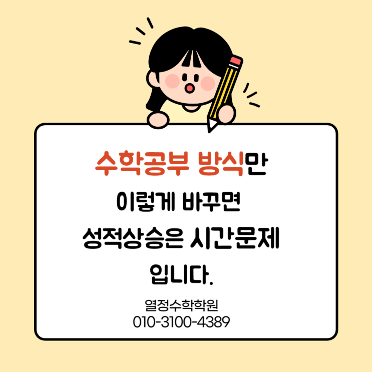 안녕하세요. 4등급의 문턱을 넘지를 못하는 성적을 최소 3등급까지 올려줄 수 있는 열정수학학원 입니다. 가끔씩 학부모님과 입학상담을 진행하면서 공통적으로 하시는 말씀이 있습니다. 자녀가 공부를 아무리 열심히 해도 성적이 오르지 않는다는 것 입니다. 하지만 성적이 오르지 않는 본질적인 이유는 노력이 부족해서가 아니라 공부 방법이 잘못되었기 때문입니다. 열정수학에서는 학생들에게 “열심히보다 제대로” 공부하는 방법을 먼저 알려줍니다. 그럼 지금부터 실제로 열정수학 원생들에게 지도하는 공부방식을 쉽고 간결하게 알려드리겠습니다. 1. 개념이해 없이 바로 문제풀이를 시작하지 않기 많은 학생들이 공식만 외우면 모든 문....... <img src="https://blogthumb.pstatic.net/MjAyNjAyMTFfNjMg/MDAxNzcwODAwMjMzMjE3.Jo6EyE1hHwTSBRKISUTOvfuzMGscTfQieAgmADUgiXgg.IoJejo5EgW4oPdZcC_GrWXUTn61WxSHdQDwkplk8paMg.PNG/%BA%ED%B7%CE%B1%D7_%B4%EB%C7%A5%C0%CC%B9%CC%C1%F6%C0%CC%C0%B8-001.png?type=s3" />