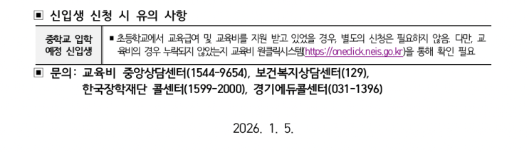 안녕하세요 목감제이원입니다. 며칠 전에 산현중학교 전학 절차 및 교과서 배부, 방과후 지원금으로 포스팅을 올렸는데요~ 아이엠스쿨 등을 통해 공지가 이미 된 사항들을 정리해서 전해 드리는 글이었습니다. 그중 교육급여 및 교육비 지원과 관련된 사항은 '2026년 3월 중에, 주민센터 또는 온라인 신청'이 필요합니다. 조남중학교는 교육비 지원과 아무런 관련이 없으니 이 부분 꼭 참고하셔야 합니다...! 혹시 문의를 원하시면 공문 맨 아래 있는 기관들이 관련 부서들이니 이쪽에 전화하셔야 해요~~ 지금 조남중학교에서 관련 문의로 애를 먹고 있다고 합니다ㅠㅠ 교과서 배부 및 임시 시간표, 반 배정 같은 부분은 어떻게 되는 건....... <img src="https://blogthumb.pstatic.net/MjAyNjAyMTNfMTY4/MDAxNzcwOTczNDM1Nzc4.cfQRhhKN14DTcRArka2SNxQhzq4F1rLBX-YDbjrBhawg.4V--XJFuKoxHpynlcT5PMFvUa8mMbi4s2KV1SFWFet0g.PNG/image.png?type=s3" />