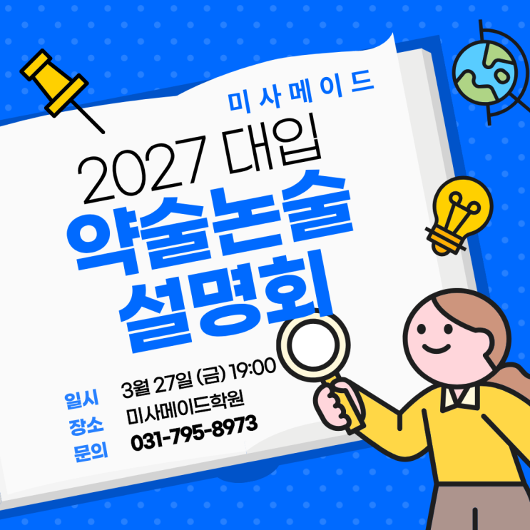 안녕하세요. 하남미사에서 가장 전문적으로 논술수업을 하고 있는 미사메이드학원입니다. 1차 약술논술 설명회 이후, 한반이 마감되었습니다. 그래서 2차 설명회를 준비했습니다. 메이드 여러 지점 중 가장 많은 합격자가 나왔습니다! 모두를 합격시키시겠다는 선생님들을 소개합니다! 2027 대입 약술논술 설명회에 초대합니다. *일정 : - 2026/3/27(금) 오후 7시 *설명회 주제 누적된 데이터 + 올해 논술 결과를 기반으로 ▷EBS 연계교재의 중요성 (내신, 수능, 약술형 논술 필수 교재) ▷27학년도 중하위권 국어 학습 전략 ▷수능, 내신, 약술형 논술 통합 커리큘럼 ▷메이드수업만의 특징 *학생과 학부모님 함께 참석하시기를 추천드립니다. *....... <img src="https://blogthumb.pstatic.net/MjAyNjAzMTdfNzEg/MDAxNzczNzQ3ODAyMzc4.71zFwFVAblOUISYz9GFDJmKHeODdCQSWOXLH6G0xmHYg.ugNy3W5IrWM4BtY76voCvcXgvXnikDcB_STR7PvNcZkg.PNG/%C1%A6%B8%F1%C0%BB_%C0%D4%B7%C2%C7%D8%C1%D6%BC%BC%BF%E4._%283%29.png?type=s3" />