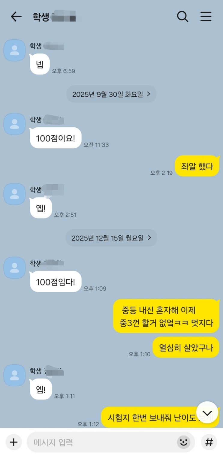 (2025년도) 신릉중2 기말시험은 전교생 중 100점 받은 학생이 오직 한명이였습니다. 그 학생이 재원생이라 너무 기쁘네요. 수학을 워낙 즐기는 아이라 선행위주의 수업으로 진행중이며 고등선행도 많이 진행된 상황이라 중3 내신도 알아서 잘할거라 믿습니다. 남들은 2025년도 기말은 어려웠다고 하지만 그밖의 저의 핵심이들 상당수는 80점대이상 90점대를 유지하고 있습니다. 시간 낭비 없이 학생 개개인 역량별 난이도에 맞춰 진행합니다. <img src="https://blogthumb.pstatic.net/MjAyNjAyMDhfMTY3/MDAxNzcwNTU2ODcwOTk0.glfb4UOkNuY4j4ENFk8WLTGJ64dfzO5mRECh9nJC4jEg.Uk0nF1w1KqQCCqHXTQ8379drg1jv4IdGTuR6Gle8Qzcg.JPEG/900%A3%DFScreenshot%A3%DF20260208%A3%DF221407%A3%DFKakaoTalk.jpg?type=s3" />