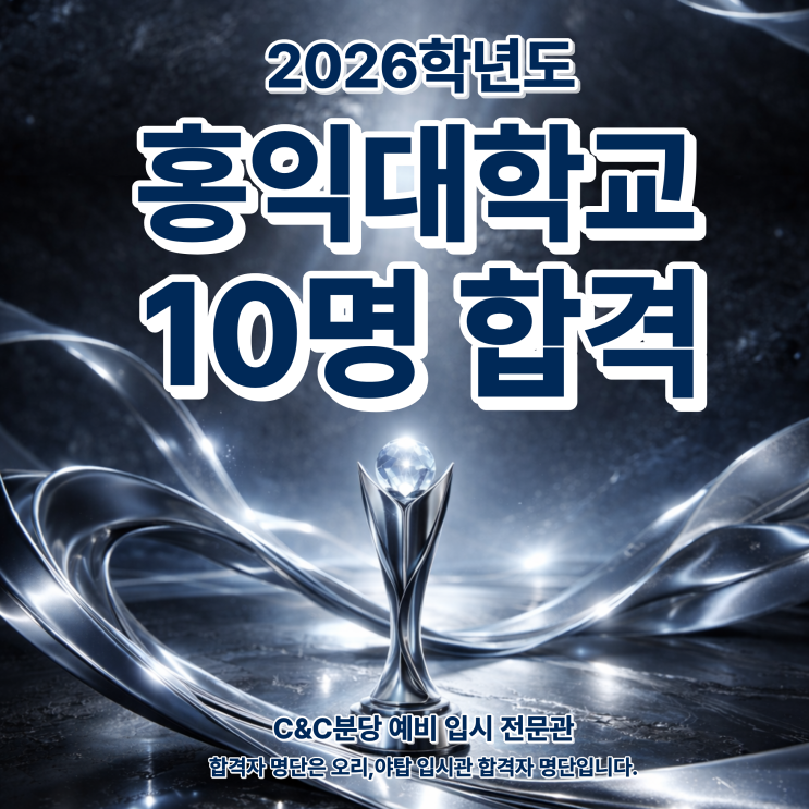 홍익대학교 10명합격!! 2026학년도 13년 연속 합격 쾌거!! 미리 준비된 우리 학생들의 전략적 합격의 성과!! 2026학년도 홍익대 합격 10명 배출! 홍익대 13년 연속합격자 배출!! 분당정자미술학원 씨앤씨의 안정적인 교육시스템을 증명합니다. 홍익대학교 합격은 단기간 집중 훈련만 으로는 도달하기 어려운 결과 이기에, 저학년 부터 체계적인 준비과정과 전략적 관리 시스템의 결실이라는 의미가 있습니다. 2026학년도 홍익대학교 모집요강 살펴보기! ❗️수시 전형방법 1단계 (3배수) 교과20% + 서류 80% 2단계 40%(1단계성적) + 면접60% ❗️수시 교과 반영 방법 교과 점수(수시20%)는 국어, 영어, 택1(수학,사회,과학 중 이수단위 합....... <img src="https://blogthumb.pstatic.net/MjAyNjAyMTlfMTg0/MDAxNzcxNTAxNjMyNTYw.AE99WalgxXOtZ5t5f8f60X1u8hUB18-IMK8GCbmO208g.6TwZyI5wTNslzSVomx9jNZGYECWDyas6nDukWwgKrf0g.PNG/%C8%AB%B4%EB%C7%D5%B0%DD%C0%DA%BD%E6%B3%D7%C0%CF1.png?type=s3" />