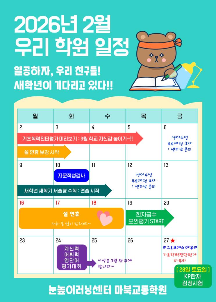 한 달 남은 겨울방학!! 알차게 마무리할 수 있도록~ 열공할 우리 학원, 2월 일정 안내드려요~ 방학특강도 마무리하고~ 기초학력진단평가도 보고~ 계산력, 어휘력, 영단어 평가대회도 준비하고~ KP급수평가도 준비하고~ 예비초등반 학교 입학도 준비하고~ 바쁘고 바쁜 2월입니다~!! 바쁜 2월을 보내고 맞이할 3월에 작은 기쁨이 될 수 있도록 "팝콘데이" 를 준비하고 있어요~ :) 열공하는 우리 학원을 소개해주시는 감사한 학부모님을 위해 작은 선물을 준비했습니다~ 소개해주신 어머니께도, 소개받으신 어머니께도 모두 드릴게요~ 우리 아이에게 어떤 공부가 맞을까? 어떤 적성을 가지고 있을까? 우리 아이 지문 속에 숨겨진 적성을 찾....... <img src="https://blogthumb.pstatic.net/MjAyNjAyMDJfNzQg/MDAxNzcwMDAxNzY4OTQ2.a82KGDDlrpKG2ew3F63dxu7VyAvlGQvWIjl9wy4uKGYg.NVJ35R1bTtX6qLyY47xD50SXilQaSvwvn_yTQOohJbYg.PNG/%BD%BD%B6%F3%C0%CC%B5%E52.PNG?type=s3" />