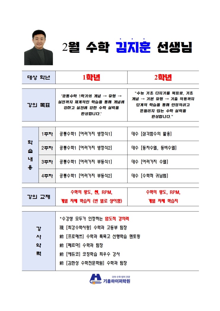 【기흥하이퍼학원 2026. 2월 강사별 강의 계획표】-기흥구청 신갈동 구갈동 고등부 국어 영어 수학