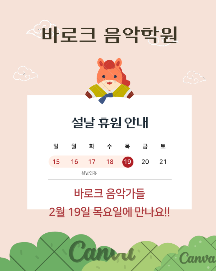 안녕하세요, 바로크 음악 학원입니다. 어느덧 2026년 설 명절이 다가왔습니다. 그동안 열심히 연습해 온 우리 음악가 친구들도 잠시 쉬어가는 시간입니다. 설 연휴 동안 가족들과 따뜻한 시간 보내고, 맛있는 음식도 많이 먹고, 웃음 가득한 명절 보내길 바랍니다. 새해에는 더 즐겁게 배우고 더 멋지게 성장하는 한 해가 되길 응원합니다. 설 연휴 기간은 2월 16일(월) ~ 2월 18일(수) 휴원이며, 2월 19일(목)요 일부터 정상 수업으로 진행됩니다. 모두 새해 복 많이 받으세요. 2026년에도 바로크 음악 학원은 아이들의 성장을 응원하겠습니다. 피아노. 바이올린. 플루트 신입생 모집 교육문의 031-274-8088 010-3943-7805 <img src="https://blogthumb.pstatic.net/MjAyNjAyMDZfMTAw/MDAxNzcwMzU1MzAxMzU2.speeRcW_sZ2kyUzf3uTQyGXMfXendRt1pklaH8dhYPAg.ukjKoiEEyXczz8RUWd4GwasmMsjVteUmBOtxH5crdoYg.PNG/900%A3%DF1770355291935.png?type=s3" />