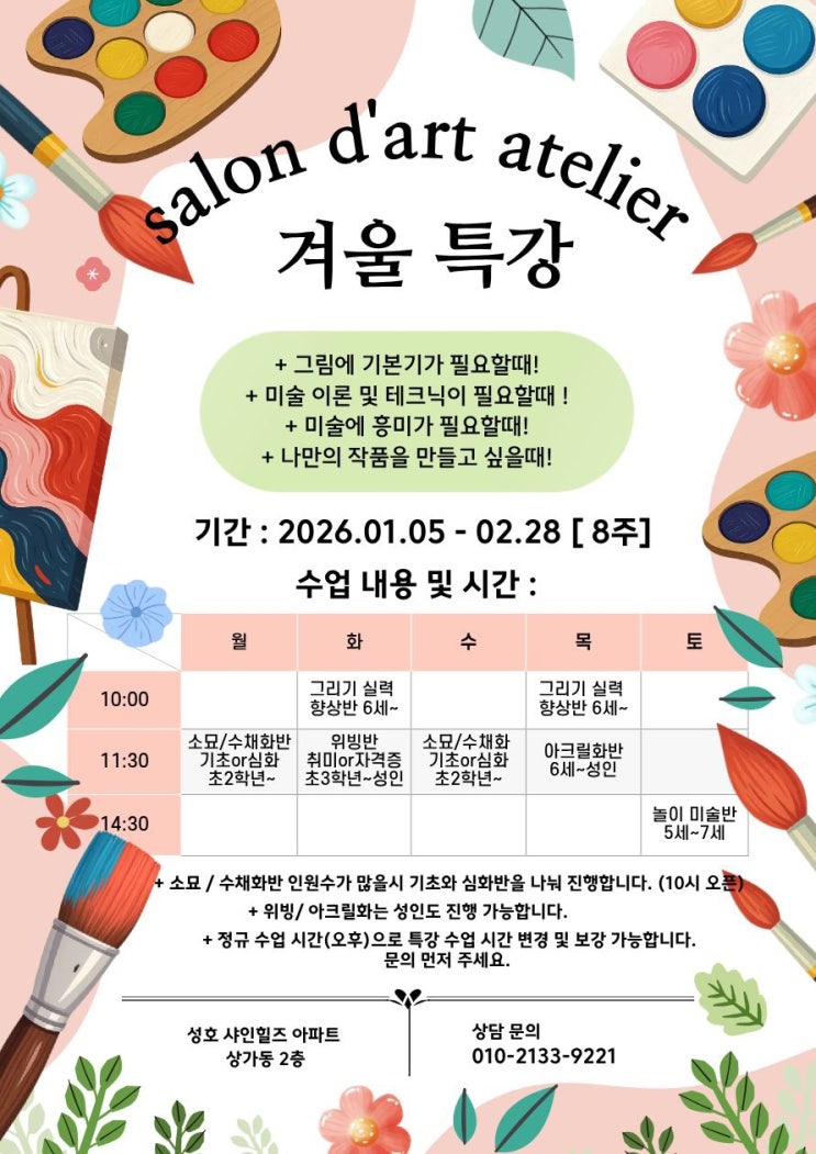 ❄️ 방학 특강 안내 ❄️ 오랜만에 올리는 게시물이 방학 특강이네요 소식은 못 남겼어도 열심히 달리고 있는 쌀롱아트 미술학원 입니다 유독 긴 겨울 방학 함께 그림 그리며 알차게 보내봐요❤️ ❄️ 소묘 ,수채화 기초/ 심화반 : 월 수 11:30~ 주 2회 ❄️ 그리기 실력 향상반 : 화 목 10:00~ 주 2회 ❄️ 위빙 취미반/ 자격증반 : 화 11:30~ ❄️ 아크릴화반: 목 11:30~ ❄️ 놀이 미술반 : 14:30~ 각 수업은 90분씩 진행됩니다 자세한 수업 내용 및 문의 사항은 010 2133 9221 로 연락 주세요❤️ #쌀롱아트아뜰리에 #보정동미술학원 #구성미술학원 #소현초미술학원 #소현중미술학원 #이현초미술학원 #수지구청미술학....... <img src="https://blogthumb.pstatic.net/MjAyNTEyMTVfMjI5/MDAxNzY1Nzk0MjQxNzg3.GSHgosCREYBvFdg0LJhO7Ia6I3jD4tB1fxZHGepNA2Yg.4FuvJL_KK_2oeFaxvSZG3m89EDxWLz0Dec1O7TRrUQMg.JPEG/IMG%A3%DF6670.JPG?type=s3" />