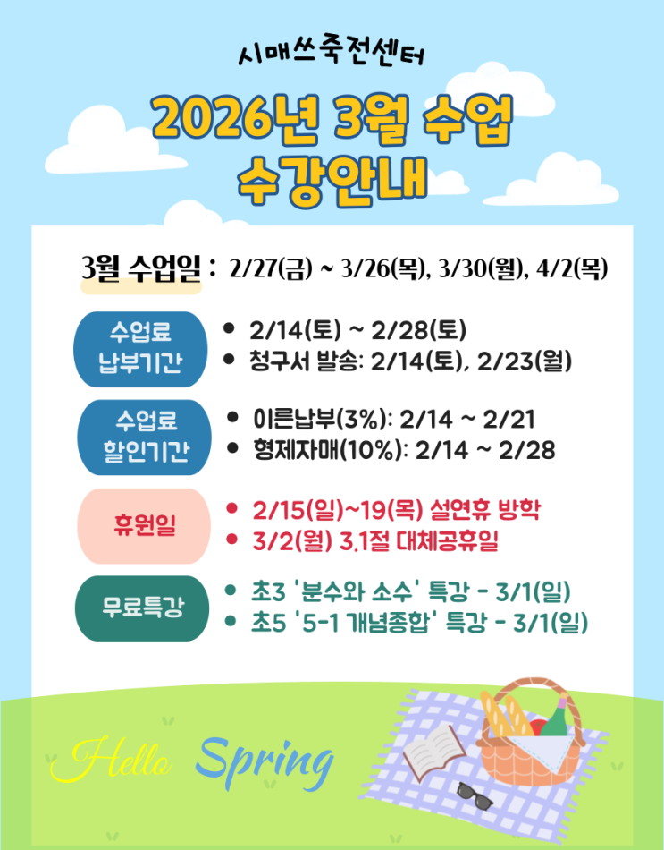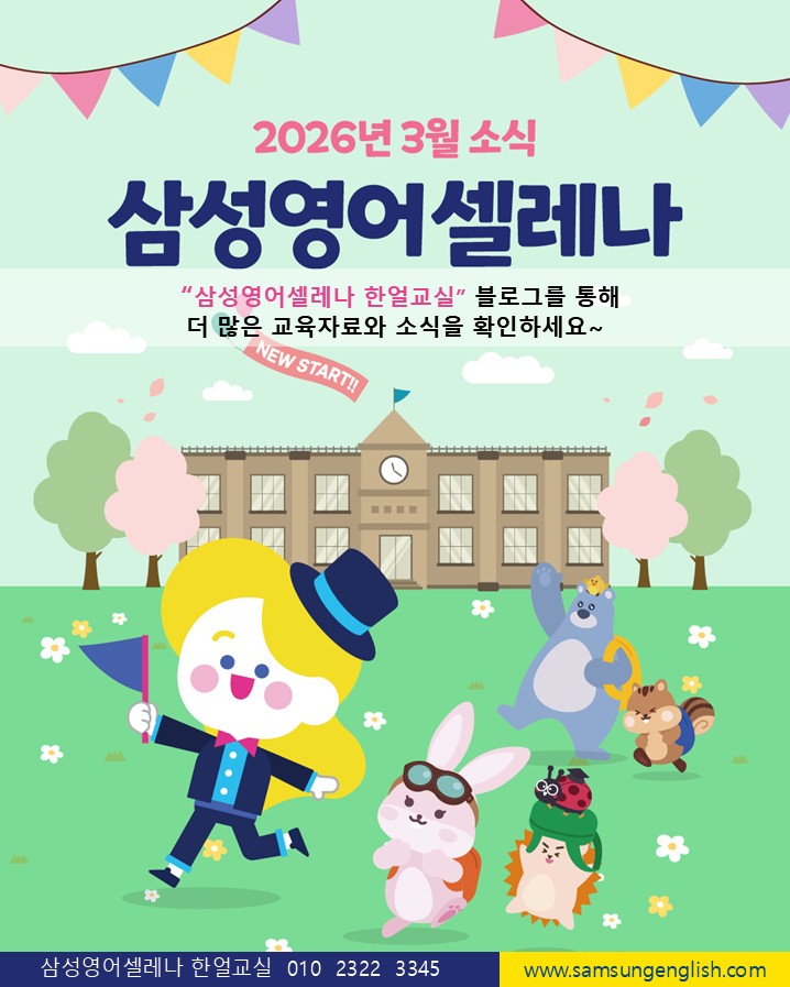 안녕하세요? 26년이 벌써 두달이 흘러 3월 소식을 전해드리게 되었습니다. 2월엔 특강을 진행하느라 정신이 없이 흘러갔어요. 그럼 3월엔 또 어떤 소식들이 기다리고 있을까요??^^ 2월에 설연휴로 인하여 3월 6일(금)까지 2월 수업일수가 잡혔었죠. 따라서 3월 수업은 3월 9일(월)~4월 3일(금)까지니 참고해 주세요.~~ 아이들이 숙제를 열심히 하면 셀레나 포인트를 모을 수가 있어요. 많이많이 모아서 예쁜 굿즈를 구입하세요.~~~^^ 중등 과정은 주 6타임을 진행합니다. 원하는 요일과 시간을 정하세요. 개인별 맞춤학습이 진행됩니다. 특히 금요일 7시타임엔 중등 클리닉 시간이니 꼭 참석해야 한답니다.~!! 해마다 느끼는 점인데요.~~ 아이들....... <img src="https://blogthumb.pstatic.net/MjAyNjAyMjVfNCAg/MDAxNzcyMDA0NTM1MjQx.R6E_l2n_xqHfS5r8kDXsYswJ78yn0nhcnuk1CQKFk7Ig.nnLTPqXvm80MuGP1SgagwYlN9hBdTlwFyF41TJIVIU8g.JPEG/%BD%BD%B6%F3%C0%CC%B5%E51.JPG?type=s3" />