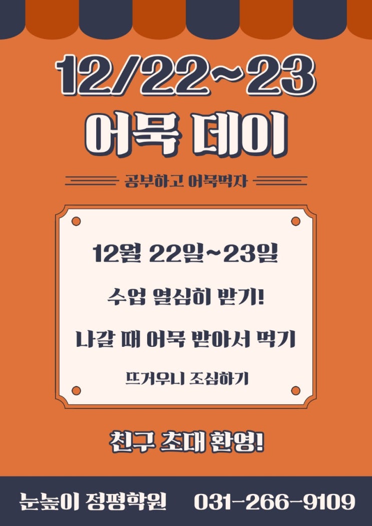 ❣️안녕하세요 정평학원입니다❣️ 날이 많이 추워진, 엄연한 겨울입니다☃️ 곧 있으면 눈이라도 올 것 마냥, 쌀랑한 하루가 지속되고 있네요. 학부모님과 아이들의 건강 관리 유의하시길 바라며, 12월 이벤트 안내드립니다! 날이 추워졌으니 뭐니뭐니해도 어묵이죠! 12월 22~23일 양일간, 추운 날씨를 뚫고 학원에 오는 친구들을 위해 따뜻한 어묵을 준비했답니다. 여기서 잠깐! 어묵데이 규칙!! 1. 수업이 끝난 후 학원 내에서 먹기 2. 꼬치는 위험하므로 들고 나가지 않기 3. 바쁜 친구들을 위해 포장도 가능 친구와 함께, 부모님과 함께 학원에서 따뜻한 어묵을 맛있게 먹고 즐거워하길 바랍니다 원래 그 날 오지 않는 친구들도 오....... <img src="https://blogthumb.pstatic.net/MjAyNTEyMDRfMTE1/MDAxNzY0ODMxMTYzNTMw.Ucrhpud0LH58iMSP2byOZoXL5jmOmgAJnndLyPFBw0gg.PcCJ2upw4M8y00xfvUVZGJulO7IfUcyQMfW6ASuP5hMg.JPEG/0_gahUd018svc198mwthay8pf6_fbyo7b.jpg?type=s3" />