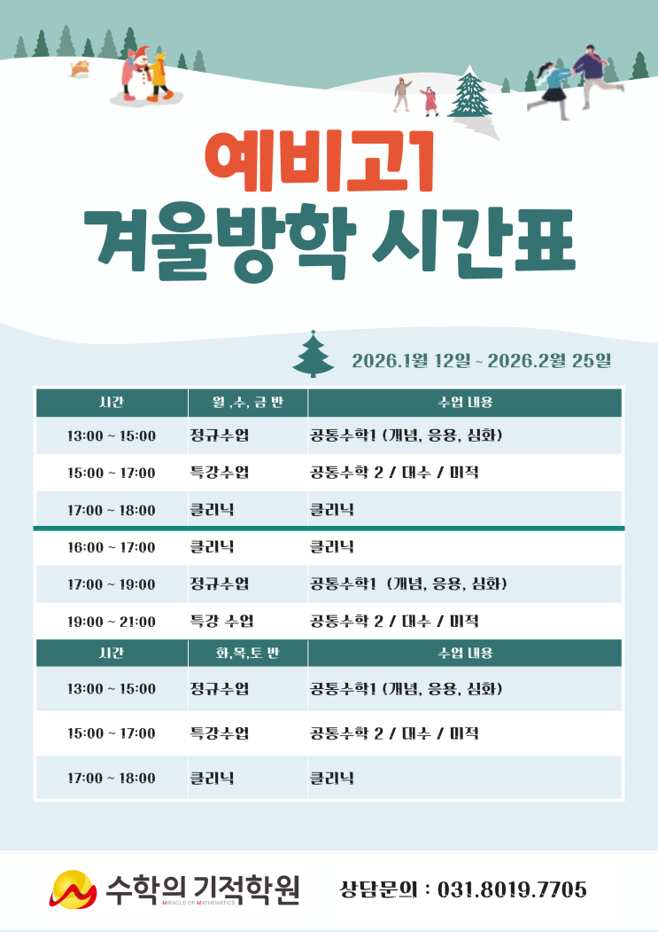 안녕하세요, 1등급을 만드는 수학의 기적 입니다. ❄️ 예비고1 겨울방학 수업시간 안내 중학교 졸업을 앞두고 고등학교에 진학하는 예비고1 학생들에게 겨울방학은 향후 3년의 수학 성적을 결정짓는 가장 중요한 시기입니다. 고등 수학의 첫 관문인 공통수학Ⅰ은 개념 간 연결성이 강하고 난이도도 급격히 올라가기 때문에, 방학 동안의 체계적인 학습이 필요합니다. 수학의 기적학원에서는 예비고1 학생들이 쉽게 이해하면서 확실하게 실력을 끌어올릴 수 있도록, 정규수업 + 특강 + 클리닉(개인 맞춤 관리) 구조로 겨울방학 프로그램을 준비했습니다. 프로그램 구성 1. 정규수업 – 공통수학Ⅰ (개념·응용·심화) 고1 첫 학기에 배우는 공....... <img src="https://blogthumb.pstatic.net/MjAyNTEyMDVfMTcy/MDAxNzY0OTE3NjQxODk1.IBUXizcb_AWji5bm_pABurfCKQtq9dX6OVBXzXox13sg.2vu1i6XkDsqR9KSN6zV6c3XKVnuLVqN5FNXXgDCYVlIg.PNG/%BF%B9%BA%F1%B0%ED1_%B0%DC%BF%EF%B9%E6%C7%D0_%BD%C3%B0%A3%C7%A5.png?type=s3" />