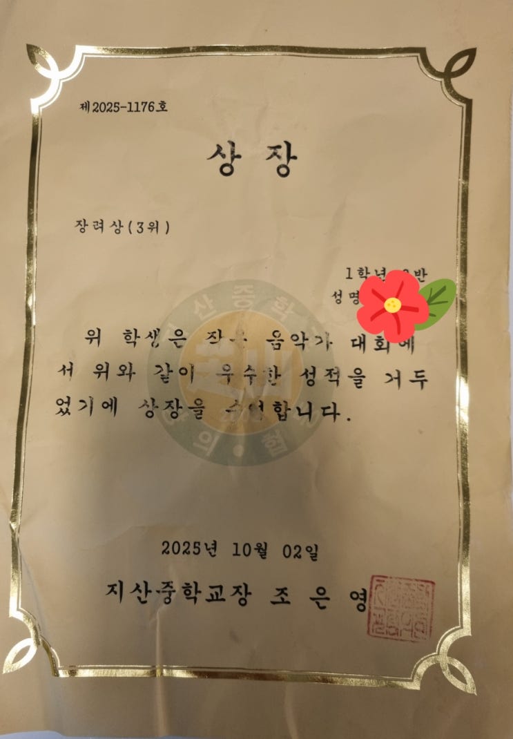 [예인피아노]2025년10월 지산중학교 콩쿨대회 장려상