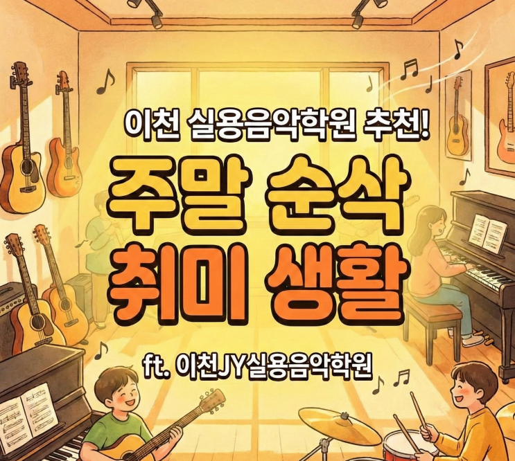 이천 실용음악학원 추천! 주말 순삭하는 취미 생활 ft. 이천 JY실용음악학원 안녕하세요! 즐거운 음악 생활을 응원하는 이천 JY 실용음악학원입니다. 여러분은 주말을 어떻게 보내고 계신가요? 혹시 밀린 잠을 자거나, 스마트폰만 보며 무의미하게 시간을 보내고 있진 않으신가요? 나만의 특별한 취미 시작 "내가 할 수 있을까?", "박치인데 괜찮을까?" 고민하지 마세요. 음악은 재능 있는 사람만의 전유물이 아니라, 누구나 즐길 수 있는 놀이입니다. 저희 학원에서는 1:1 맞춤형 레슨을 통해 왕초보 분들도 쉽고 재미있게 입문하실 수 있습니다. 다양한 맞춤 클래스 왜 이천 JY실용음악학원인가요? 탄....... <img src="https://blogthumb.pstatic.net/MjAyNjAxMjhfMjI5/MDAxNzY5NTg0OTYyNDA5.XDX8TOwTsH7HH8Lhy7GqONxYr9vVE4dsULO_UTU0W1sg.IZ6sPAipJMP4eFUIlpyfX3a5OwkcG8EfvW5o8A-lTNsg.PNG/Gemini_Generated_Image_5q3kyd5q3kyd5q3k.png?type=s3" />
