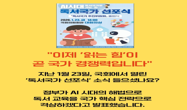 안녕하세요. 웅진씽크빅 이천지국 지국장입니다. AI시대는 "읽는 힘이 곧 국가 경쟁력입니다." 국가에서 독서교육을 국가 핵심전략으로 격상하겠다고 발표했습니다. 최근 학부모 상담에서 가장 많이 나오는 고민이 바로 국어 독해력입니다. ✔ 책은 읽지만 내용 설명이 어려운 경우 ✔ 문제를 끝까지 읽지 않고 감으로 푸는 경우 ✔ 수학·사회·과학에서도 지문 이해가 느린 경우 이런 경우 대부분 ‘학습량’보다 독해의 기초 구조가 잡히지 않은 상태입니다. 웅진씽크빅 바로독해는 이렇게 구성됩니다 ① 독해력 중심 동화·소설·설명문·실용문 등 교과서 연계 글 유형 학습 전체 내용 이해 → 핵심 파악 → 사고 확장까지 단계별....... <img src="https://blogthumb.pstatic.net/MjAyNjAyMDVfMTAx/MDAxNzcwMjY5MzUyMzkw.9sZwW9P4IFd_YGII9UTjN1H3khj3D8ArhIYZvh9sb-og.EaAjN7vUrY8Nsi30qvSdasEGcr7nBEF6dzrRNfzWKmsg.PNG/image.png?type=s3" />