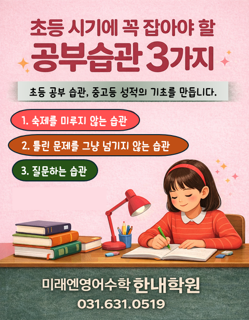 초등 시기에 꼭 잡아야 할 공부 습관 3가지 안녕하세요. 미래엔영어수학 한내학원입니다. 학부모님들과 상담을 하다 보면 가장 많이 듣는 질문이 있습니다. “지금 성적이 조금 낮은데 괜찮을까요?” “아직 초등인데 너무 늦은 건 아닐까요?” 이에 대해 저희는 항상 같은 말씀을 드립니다. 초등 시기에는 ‘성적’보다 ‘공부하는 방식’이 훨씬 중요합니다. 이 시기에 어떤 습관을 갖느냐에 따라 중·고등 학습 태도와 성적이 크게 달라지기 때문입니다. 오늘은 초등학생 때 반드시 잡아야 할 3가지 핵심 공부 습관을 알려드리겠습니다. ✅ 1. 숙제를 미루지 않는 습관 첫 번째는 **‘바로 시작하는 힘’**입니다. 숙제를 미루는 아이들의....... <img src="https://blogthumb.pstatic.net/MjAyNjAyMDVfMjE1/MDAxNzcwMjgwMzE4NzU5.WPI6xV8mBUzo-Ylbgh9AHgqMAC5SNuprc2FL9nzvkrIg.0MnGoxJ_w50Gx5EVwtNmJa1rD_g5uMY1MfPfNIG1XMUg.PNG/%B0%F8%BA%CE%BD%C0%B0%FC.png?type=s3" />