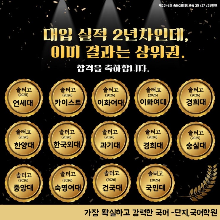 단지,국어가 올해로 개원 3년차를 맞이하다보니 대입 실적의 경우 이제사 2년차에 접어들었네요, 물론 단지,국어를 차리기 전에도 타지역 대형학원의 학년 대표강사로서 SKY, 의대 등 굴지의 대학, 학과 합격에 일조해왔지만 그래도 김포에 뿌리를 내리고 있는 학원이니만큼 우리 아이들의 대입 성과를 소개할 날이 어서 오기만을 무척 바라왔답니다. 저희 원이 워낙 솔터고 학생들의 사랑을 받는 학원인 만큼 솔터고 중심의 화려한 입결로 도배되어있지만 현 고3부터 예비고1의 경우, 다양한 학교 학생들과 함께하고 있어 점점 다채로운 학교의 입결이 나올 것으로 기대됩니다. :) 양곡과 마송은 물론 최근 개교한 김포 호수고, 운유고, 신양고....... <img src="https://blogthumb.pstatic.net/MjAyNjAyMTdfMjI3/MDAxNzcxMjk0MzcxMDIx.K631ynnGUmPEmvGik2QZOqL6GHxk_wVNBAt8VVQ9bpQg.RUGqE7DGRgUPzkGxmWdGdcEhuA1KGR2KVBjdC3y7pj4g.JPEG/%C1%A6%B8%F1%C0%BB_%C0%D4%B7%C2%C7%D8%C1%D6%BC%BC%BF%E4._%282%29.jpg?type=s3" />