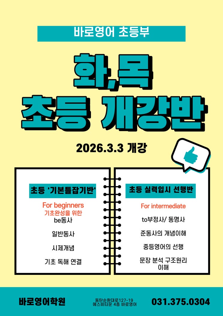 남동탄 영어학원 초등 문법 선행반 개설 산척동·동탄호수공원 초등 영어 기초반 모집 안녕하세요. 남동탄 산척동 동탄호수공원 영어학원 바로영어학원입니다. 초등 고학년을 위한 문법 중심 선행 기초반을 신규 개설합니다. 왜 지금 시작해야 할까요 중학교 영어, 고등학교 영어 성적은 결국 문법 이해력과 문장 해석력에서 결정됩니다. 초등 시기에 문장 구조가 잡히지 않으면 중등 진입 후 난이도가 급격히 상승합니다. 단어만 외우는 영어에서 문장 구조 파악과 해석 중심 영어로 전환해야 하는 가장 중요한 시기입니다. 그 중요한 시기, 남동탄 영어학원 바로영어가 함께합니다. 초등 문법 선행반 특징 ● 중등 영어 대비 문법 기초 완성 ●....... <img src="https://blogthumb.pstatic.net/MjAyNjAyMDZfMjkz/MDAxNzcwMzcxOTA0MTg0.CkPkGnLOkOObHIexrkim6YZBJJSPSZOCLwfm3x8yGqcg.K4Un5LaZMByltPju1uJHgoc0fBRYPT7anjCU1PEd9Xwg.JPEG/%C1%A6%B8%F1%C0%BB_%C0%D4%B7%C2%C7%D8%C1%D6%BC%BC%BF%E4._%2832%29.jpg?type=s3" />