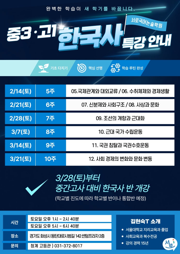 새 학기를 바꾸는 완벽한 준비, 서로국어논술학원 서로국어논술학원에서는 중3·고1 학생들을 위한 특강 프로그램을 개강합니다. 기초부터 핵심 개념까지, 그리고 중간고사 대비 완성까지 단기간에 학습 흐름을 잡을 수 있도록 설계했습니다. 이런 학생에게 필요합니다!! 새 학기 내신을 안정적으로 시작하고 싶은 학생 한국사·통합사회 개념이 막연하게 느껴지는 학생 시험 직전이 아니라 미리 준비하고 싶은 학생 중간고사 성적 상승을 확실히 만들고 싶은 학생 수업 시간 한국사 토요일 오후 1:00 ~ 2:40 토요일 오후 5:00 ~ 6:40 통합사회 토요일 오후 3:00 ~ 4:40 수업 장소 경기도 화성시 동탄대로시범길 142 센텀프라자 2층 서로국어논술학....... <img src="https://blogthumb.pstatic.net/MjAyNjAyMDdfMTY5/MDAxNzcwNDUyNjkzMjI2.SlDiD65otseSUmT51uF_6q69ZLoHxhuFbr3DmSgLM1Qg.iEfUpk9F-0x2nrD5srIFAHvaMrIHGKTzhMWYUu1EJMkg.JPEG/001.jpg?type=s3" />