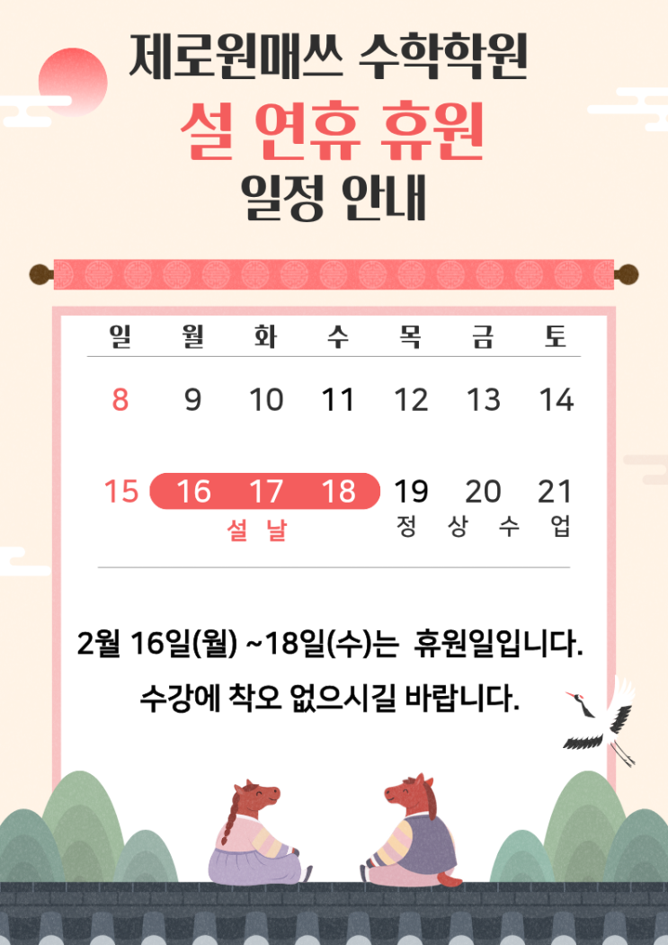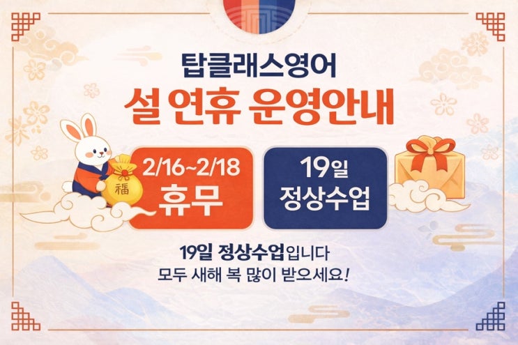 탑클래스영어 설 연휴 운영 안내 안녕하세요 Sonia 원장입니다:) 2/16(월) ~ 2/18(수) 설 연휴로 휴무입니다. 아이들은 연휴 전까지도 각자 목표에 맞춰 꾸준히, 열심히 학습하고 있습니다. 2/19(목)부터 정상수업입니다. 연휴 동안 충분히 쉬고 다시 즐겁게 공부하겠습니다. 모두 새해 복 많이 받으세요! ✨ #권선동영어학원#탑클래스영어#스마트해법영어 <img src="https://blogthumb.pstatic.net/MjAyNjAyMTBfMjQy/MDAxNzcwNzE3Nzg1MDg2.hds_qmrow9QeVsJbL4FwMxFkNnSnAy7xGbQKsPTIKzwg.oyxr77WMF8Zv1fvpHxniI40AQeudhvAoDaiGU4jv7-cg.JPEG/DCEE25D0%A3%AD9852%A3%AD414C%A3%AD94FD%A3%ADD33CD78D6942.jpg?type=s3" />