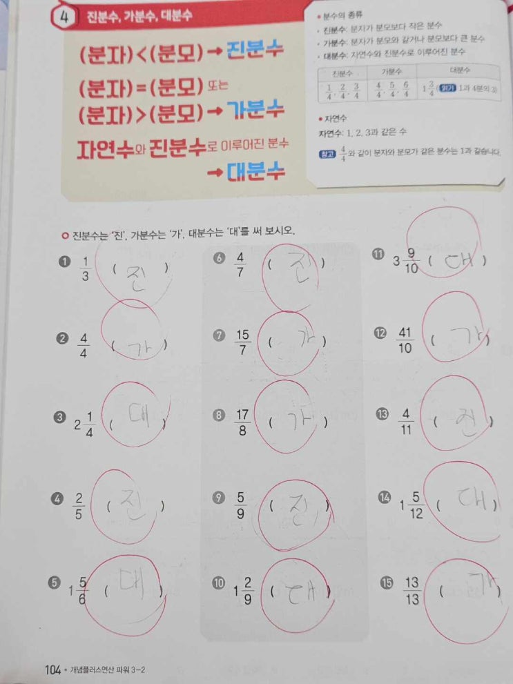 (박*린) 초등 3-2 개념플러스연산 파워 4단원 분수 학습 기록