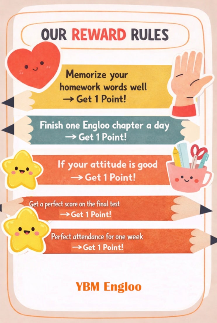 우리 아이가 스스로 공부하는 영어학원 OUR REWARD RULES “공부해!”라고 말하지 않아도 아이들이 스스로 하게 만드는 힘, 저희 학원에는 있습니다 ⸻ 우리 학원의 특별한 Reward System 아이들의 작은 노력 하나하나를 그냥 지나치지 않습니다 ✔ 숙제 단어를 완벽하게 암기하면 → 1 Point! ✔ 하루에 Engloo 한 챕터를 끝내면 → 1 Point! ✔ 수업 태도가 좋으면 → 1 Point! 노력한 만큼 바로바로 보상! 아이들은 “해야 하는 공부”가 아니라 **“하고 싶은 공부”**를 하게 됩니다. ⸻ 왜 포인트 제도일까요? 아이들은 결과보다 즉각적인 인정과 칭찬에 더 크게 반응합니다. ✔ 단어 암기 습관 형성 ✔ 매....... <img src="https://blogthumb.pstatic.net/MjAyNjAzMDVfMTY2/MDAxNzcyNjY1NTg4NjY0.aMpoEl2u857_FlvsKfnvPWhA7-a7xwSoHWZZsnIs1Ccg.x-B4Va9t_Zba-qdwVjGxGE_wbFn5zeX12EpHMe82N8Ag.JPEG/KakaoTalk_20260303_123027978.jpg?type=s3" />