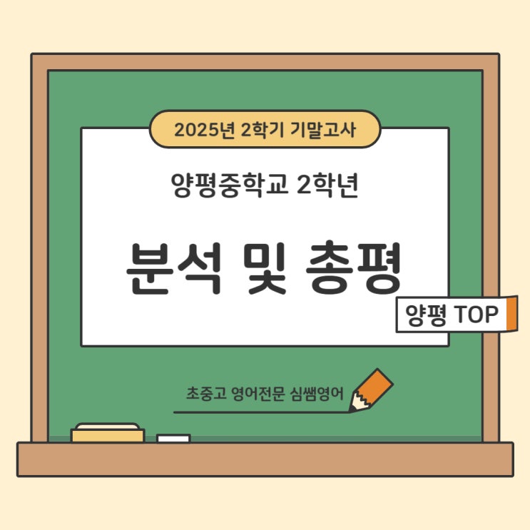 안녕하세요, 심쌤 입니다. 오늘은 양평중학교 2학년 2025년 2학기 기말고사를 분석해 보겠습니다. 시험 일시 2025년 12월 10일 수요일 시험 범위 교과서 5,6,7과: 어휘, 문법, 대화문, 본문 8과: 문법 시험 유형 선택형 24문항/ 논술형 1문항 총 평 양평중학교 2학년 2025년 2학기 기말고사는 1학기 기말고사와 비슷한 구성으로 출제되었습니다. 1학기에 비해 선택형 문항수가 한 문제 적었으나, 논술형의 문항수는 같았습니다. 또한, 눈에 띄는 점은 [문법] 문항의 감소입니다. 1학기 기말고사에서 [문법] 문항의 배점이 47점으로 거의 50점에 가까왔던 반면에, 이번 시험에서는 37점으로 10점 줄어들었습니다. 대신에, 지문을 해석하고, 정확한....... <img src="https://blogthumb.pstatic.net/MjAyNjAyMDNfMTIx/MDAxNzcwMTI5NTU0MTgz.JwcIrPxGtzw9L4keWk-jgONEaPtiRCkJmh2dvED0eLYg.pGy5oJizjCeMrPp8M3v_iWa8VbCZsahwqTxyyjM_ipog.JPEG/%BE%E7%C6%F2%C1%DF2.jpg?type=s3" />
